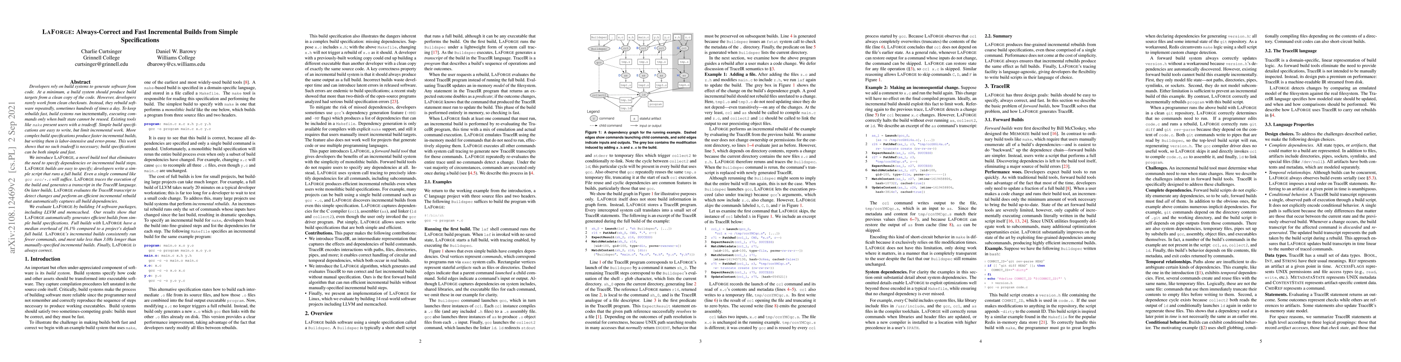Developers rely on build systems to generate software from code. At a minimum, a build system should produce build targets from a clean copy of the code. However, developers rarely work from clean checkouts. Instead, they rebuild software repeatedly, sometimes hundreds of times a day. To keep rebuilds fast, build systems run incrementally, executing commands only when built state cannot be reused. Existing tools like make present users with a tradeoff. Simple build specifications are easy to write, but limit incremental work. More complex build specifications produce faster incremental builds, but writing them is labor-intensive and error-prone. This work shows that no such tradeoff is necessary; build specifications can be both simple and fast. We introduce LaForge, a novel build tool that eliminates the need to specify dependencies or incremental build steps. LaForge builds are easy to specify; developers write a simple script that runs a full build. Even a single command like gcc src/*.c will suffice. LaForge traces the execution of the build and generates a transcript in the TraceIR language. On later builds, LaForge evaluates the TraceIR transcript to detect changes and perform an efficient incremental rebuild that automatically captures all build dependencies. We evaluate LaForge by building 14 software packages, including LLVM and memcached. Our results show that LaForge automatically generates efficient builds from simple build specifications. Full builds with LaForge have a median overhead of 16.1% compared to a project's default full build. LaForge's incremental builds consistently run fewer commands, and most take less than 3.08s longer than manually-specified incremental builds. Finally, LaForge is always correct.