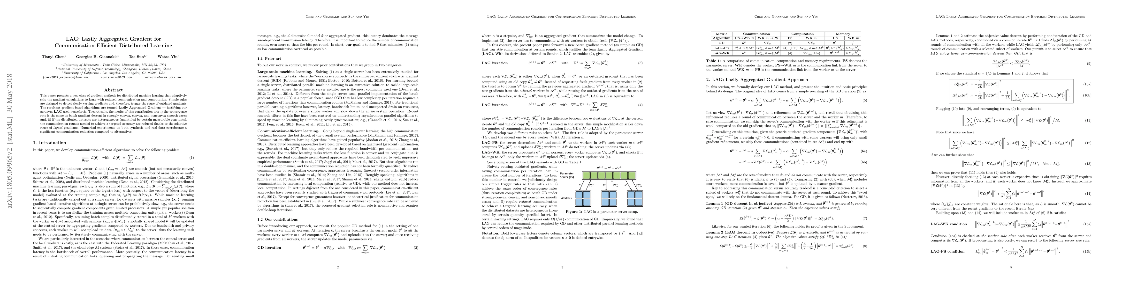 A new method called LAG reduces communication in distributed learning by adaptingively reusing outdated gradients, achieving comparable convergence rates to batch gradient descent.