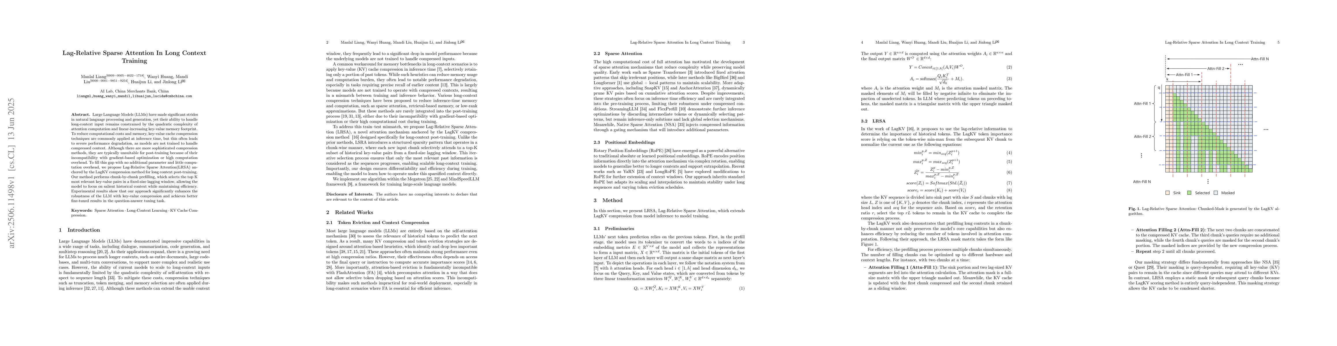 Large Language Models (LLMs) have made significant strides in natural language processing and generation, yet their ability to handle long-context input remains constrained by the quadratic complexity of attention computation and linear-increasing key-value memory footprint. To reduce computational costs and memory, key-value cache compression techniques are commonly applied at inference time, but this often leads to severe performance degradation, as models are not trained to handle compressed context. Although there are more sophisticated compression methods, they are typically unsuitable for post-training because of their incompatibility with gradient-based optimization or high computation overhead. To fill this gap with no additional parameter and little computation overhead, we propose Lag-Relative Sparse Attention(LRSA) anchored by the LagKV compression method for long context post-training. Our method performs chunk-by-chunk prefilling, which selects the top K most relevant key-value pairs in a fixed-size lagging window, allowing the model to focus on salient historical context while maintaining efficiency. Experimental results show that our approach significantly enhances the robustness of the LLM with key-value compression and achieves better fine-tuned results in the question-answer tuning task.