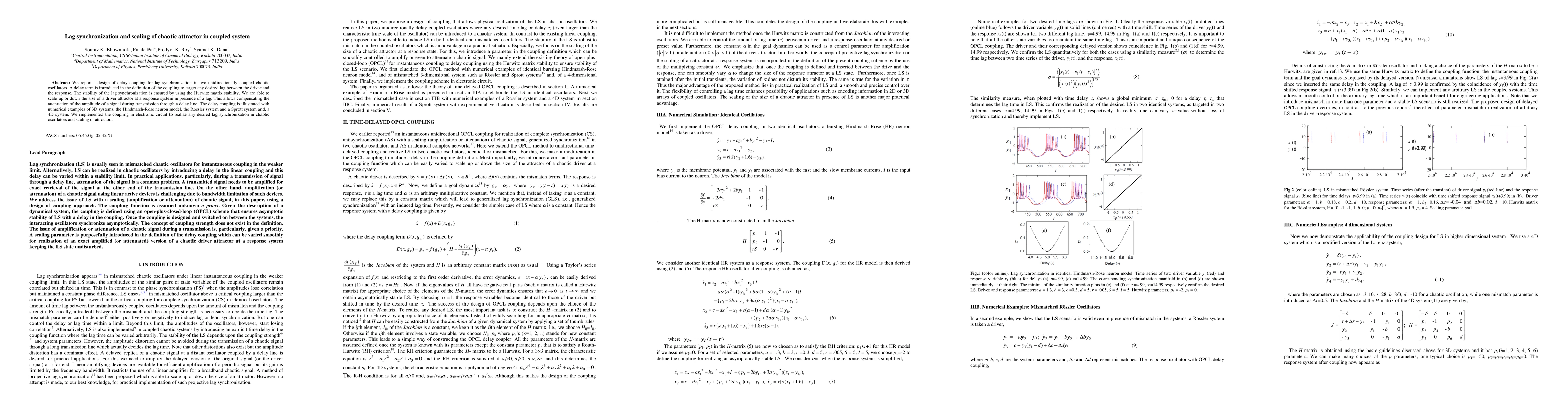 This paper presents a method for achieving lag synchronization in coupled chaotic oscillators using delay coupling, ensuring stability via Hurwitz matrix criteria. The approach allows scaling of chaotic attractors in the response system, enabling compensation for signal attenuation during transmission delays, demonstrated through various numerical and electronic circuit implementations.