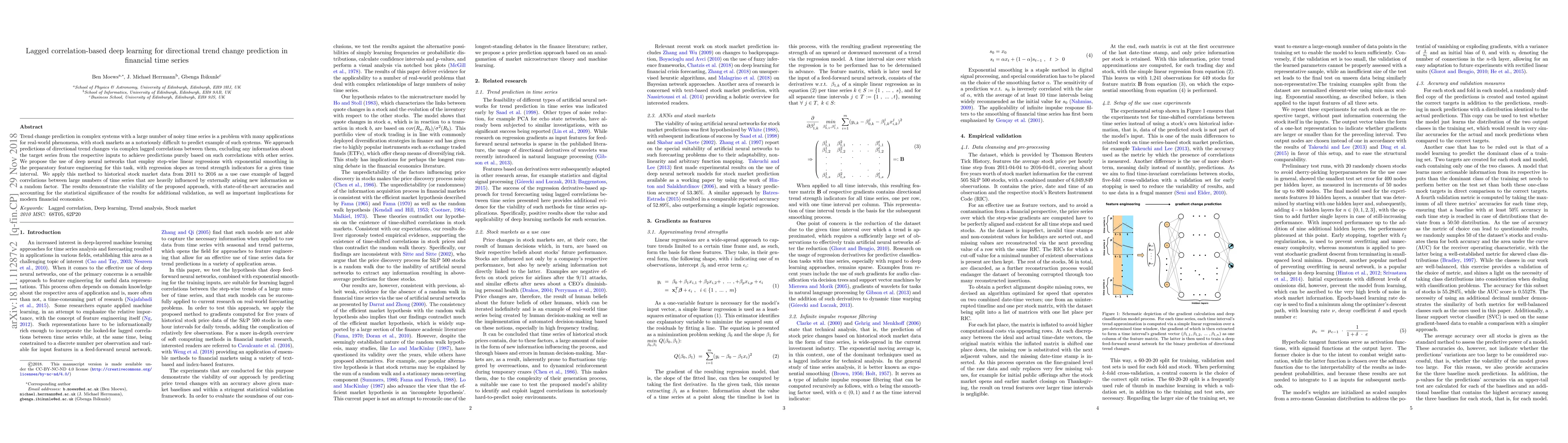 Trend change prediction in complex systems with a large number of noisy time series is a problem with many applications for real-world phenomena, with stock markets as a notoriously difficult to predict example of such systems. We approach predictions of directional trend changes via complex lagged correlations between them, excluding any information about the target series from the respective inputs to achieve predictions purely based on such correlations with other series. We propose the use of deep neural networks that employ step-wise linear regressions with exponential smoothing in the preparatory feature engineering for this task, with regression slopes as trend strength indicators for a given time interval. We apply this method to historical stock market data from 2011 to 2016 as a use case example of lagged correlations between large numbers of time series that are heavily influenced by externally arising new information as a random factor. The results demonstrate the viability of the proposed approach, with state-of-the-art accuracies and accounting for the statistical significance of the results for additional validation, as well as important implications for modern financial economics.