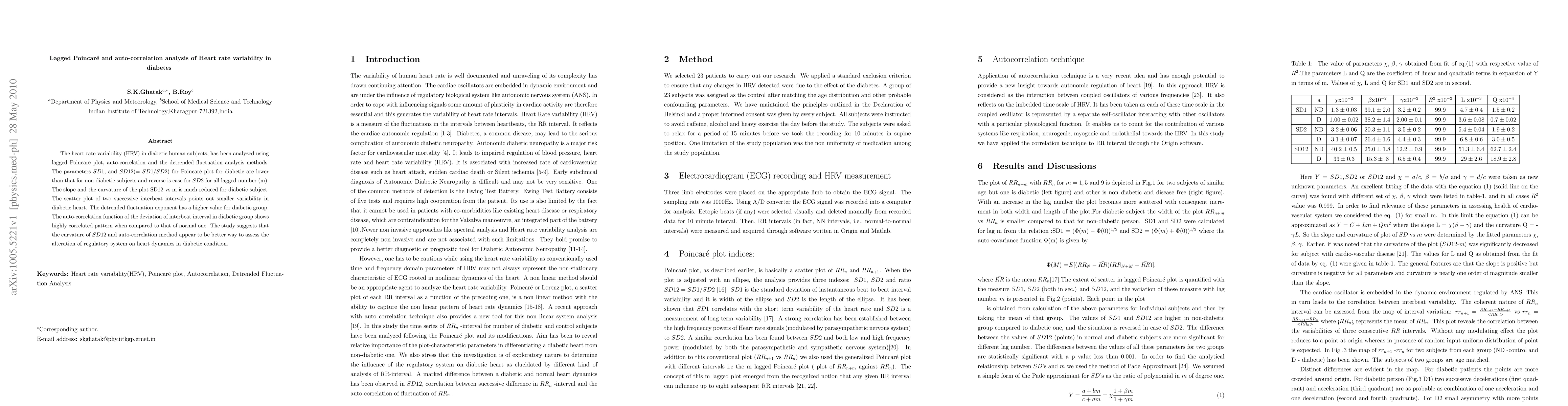 This paper analyzes heart rate variability (HRV) in diabetic patients using lagged Poincaré plots, auto-correlation, and detrended fluctuation analysis. It finds that diabetic subjects exhibit lower $SD1$ and $SD12$ values and higher detrended fluctuation exponents, indicating altered heart dynamics and regulatory mechanisms compared to non-diabetic subjects.