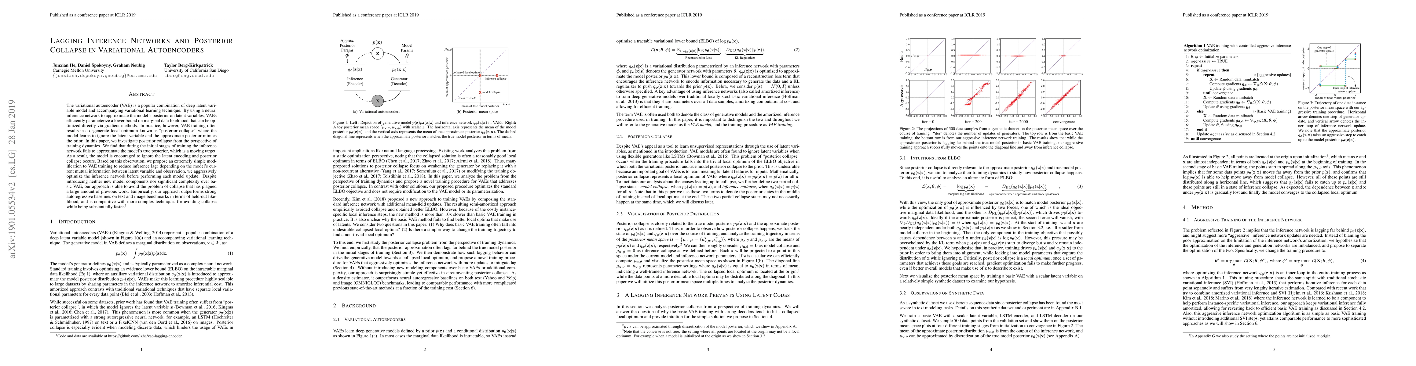 The variational autoencoder (VAE) is a popular combination of deep latent variable model and accompanying variational learning technique. By using a neural inference network to approximate the model's posterior on latent variables, VAEs efficiently parameterize a lower bound on marginal data likelihood that can be optimized directly via gradient methods. In practice, however, VAE training often results in a degenerate local optimum known as "posterior collapse" where the model learns to ignore the latent variable and the approximate posterior mimics the prior. In this paper, we investigate posterior collapse from the perspective of training dynamics. We find that during the initial stages of training the inference network fails to approximate the model's true posterior, which is a moving target. As a result, the model is encouraged to ignore the latent encoding and posterior collapse occurs. Based on this observation, we propose an extremely simple modification to VAE training to reduce inference lag: depending on the model's current mutual information between latent variable and observation, we aggressively optimize the inference network before performing each model update. Despite introducing neither new model components nor significant complexity over basic VAE, our approach is able to avoid the problem of collapse that has plagued a large amount of previous work. Empirically, our approach outperforms strong autoregressive baselines on text and image benchmarks in terms of held-out likelihood, and is competitive with more complex techniques for avoiding collapse while being substantially faster.