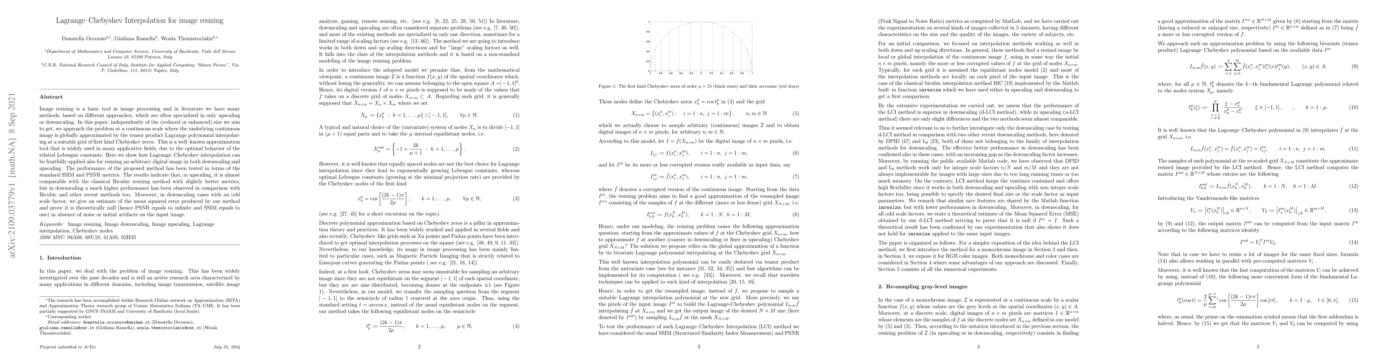 This paper proposes a novel Lagrange-Chebyshev interpolation method for image resizing, demonstrating its effectiveness in both upscaling and downscaling. The method shows competitive results with Bicubic resizing in upscaling and significantly outperforms it in downscaling, especially with odd scale factors, theoretically achieving perfect results in the absence of noise.