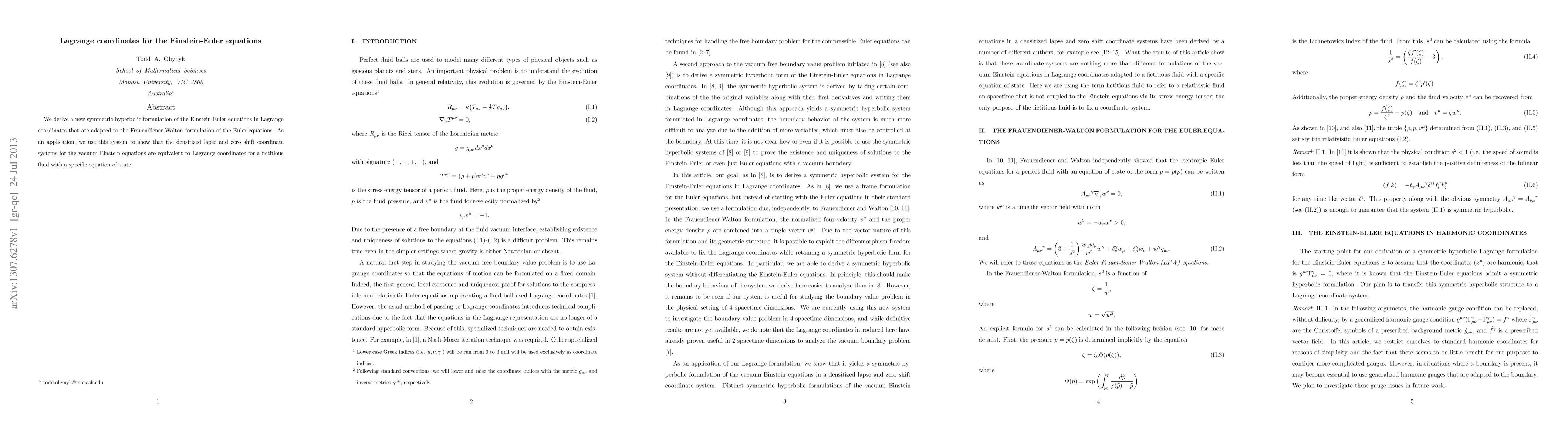 We derive a new symmetric hyperbolic formulation of the Einstein-Euler equations in Lagrange coordinates that are adapted to the Frauendiener-Walton formulation of the Euler equations. As an application, we use this system to show that the densitized lapse and zero shift coordinate systems for the vacuum Einstein equations are equivalent to Lagrange coordinates for a fictitious fluid with a specific equation of state.