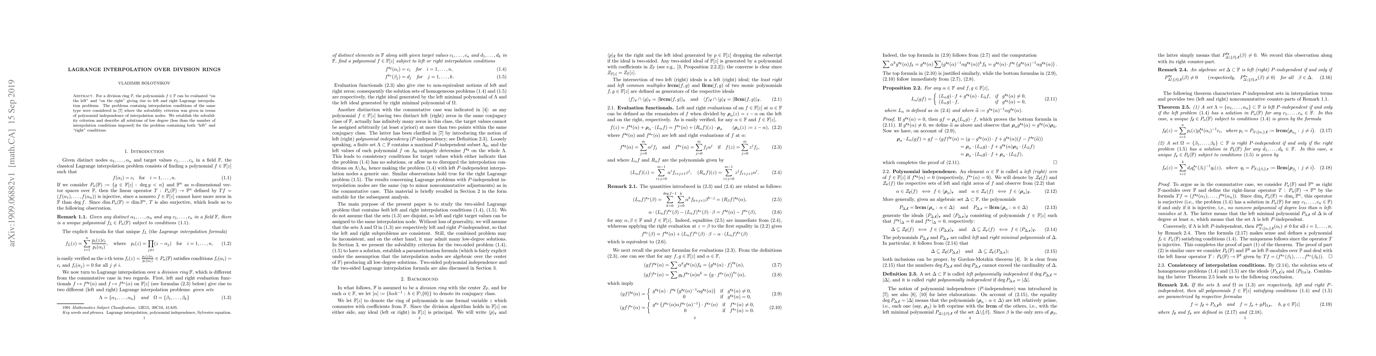 This paper explores Lagrange interpolation over division rings, establishing a solvability criterion for left and right interpolation problems and describing low-degree solutions.
