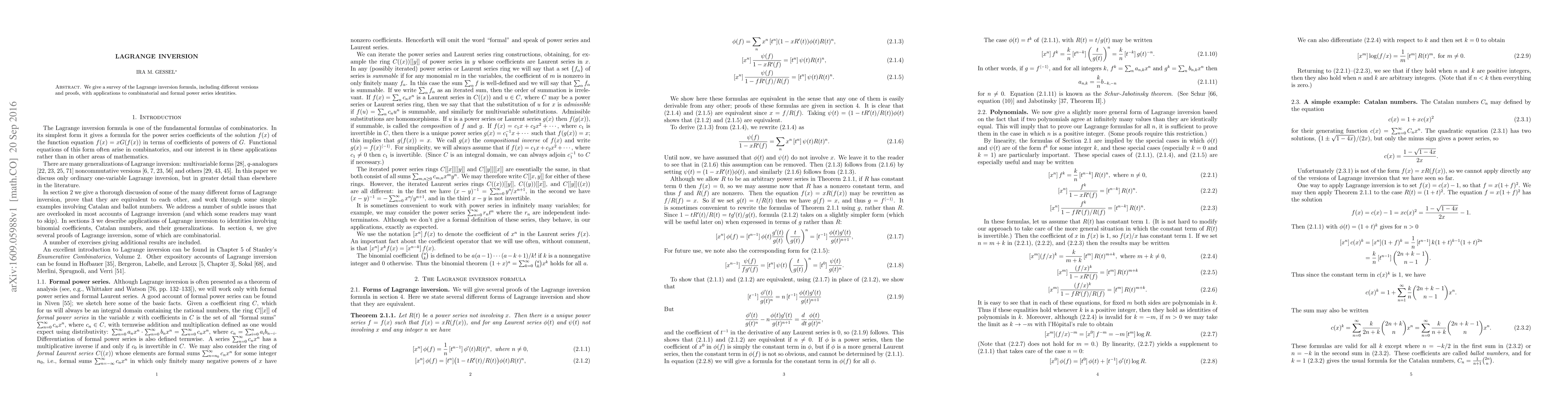 Summary: This paper surveys the Lagrange inversion formula, exploring various versions and proofs, and demonstrates its applications in solving combinatorial problems and deriving formal power series identities.