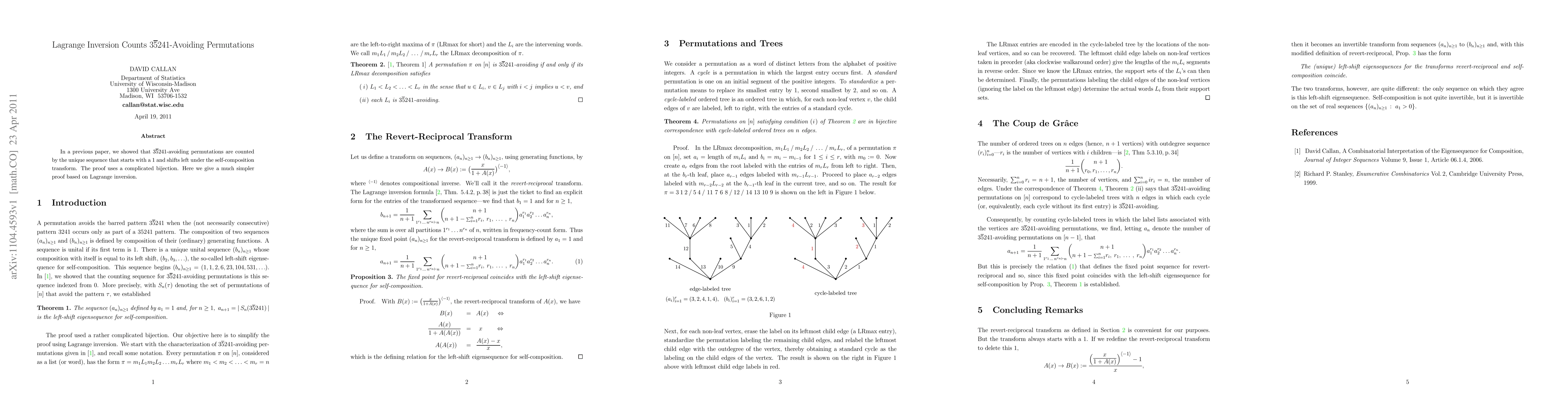 This paper provides a simpler proof using Lagrange inversion to show that the count of $3\bar{5}241$-avoiding permutations follows a unique sequence that starts with 1 and shifts left under self-composition, building on a previous result with a complex bijection.