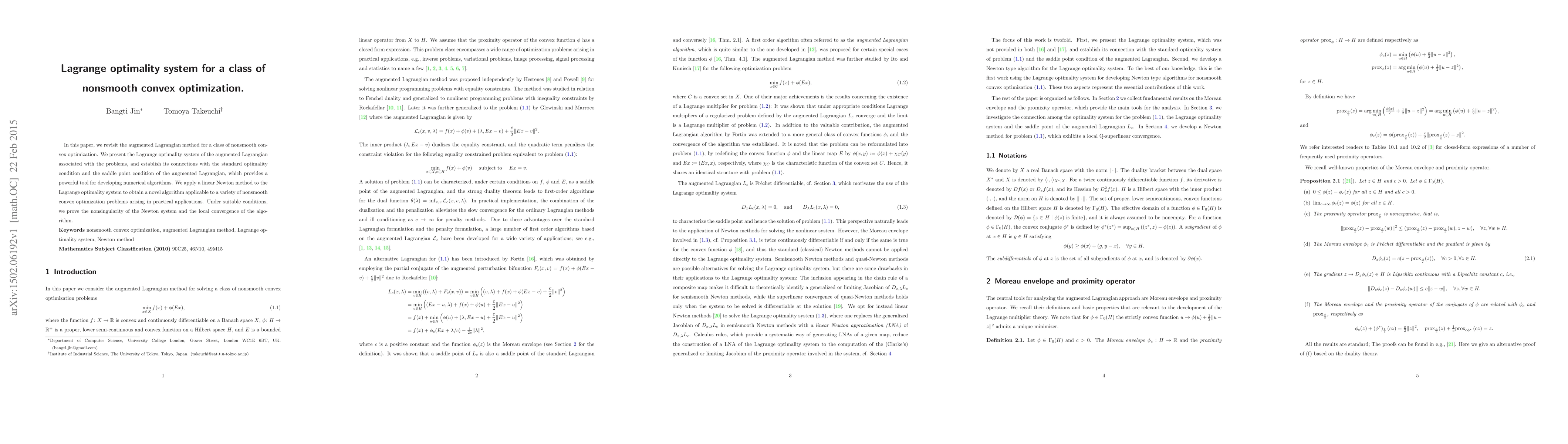 This paper develops a Lagrange optimality system for the augmented Lagrangian in nonsmooth convex optimization, establishing connections with standard optimality and saddle point conditions. A novel linear Newton method is proposed, proven to be nonsingular under suitable conditions, and shown to have local convergence.