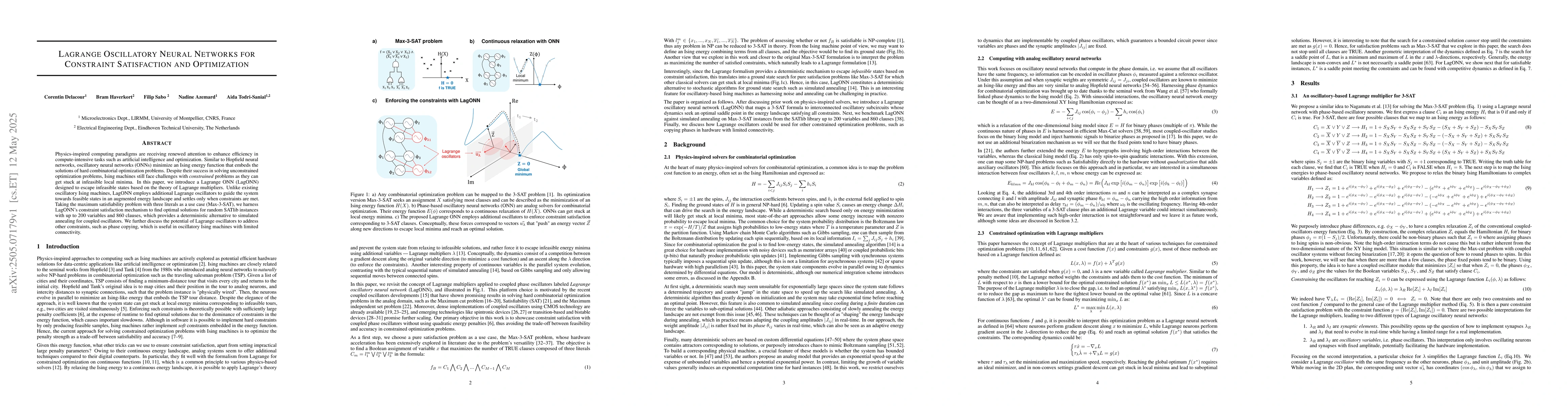 Researchers introduced Lagrange Oscillatory Neural Networks (LagONN) to tackle constrained optimization problems, achieving success in solving complex SAT problems with up to 200 variables and 860 clauses.