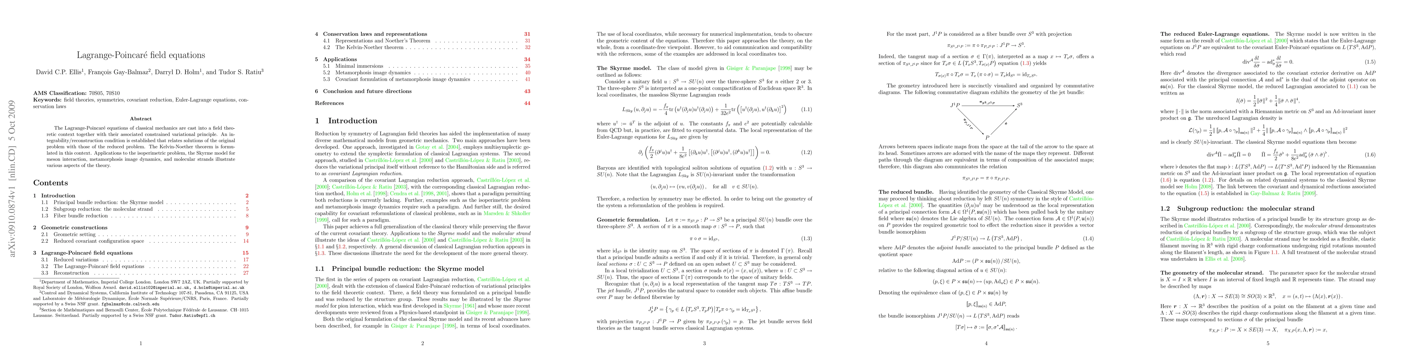 The Lagrange-Poincare field equations are reformulated within a field-theoretic framework, establishing a connection between solutions of the original and reduced problems. The Kelvin-Noether theorem is also presented, and the theory is applied to the isoperimetric problem, Skyrme model, metamorphosis image dynamics, and molecular strands.