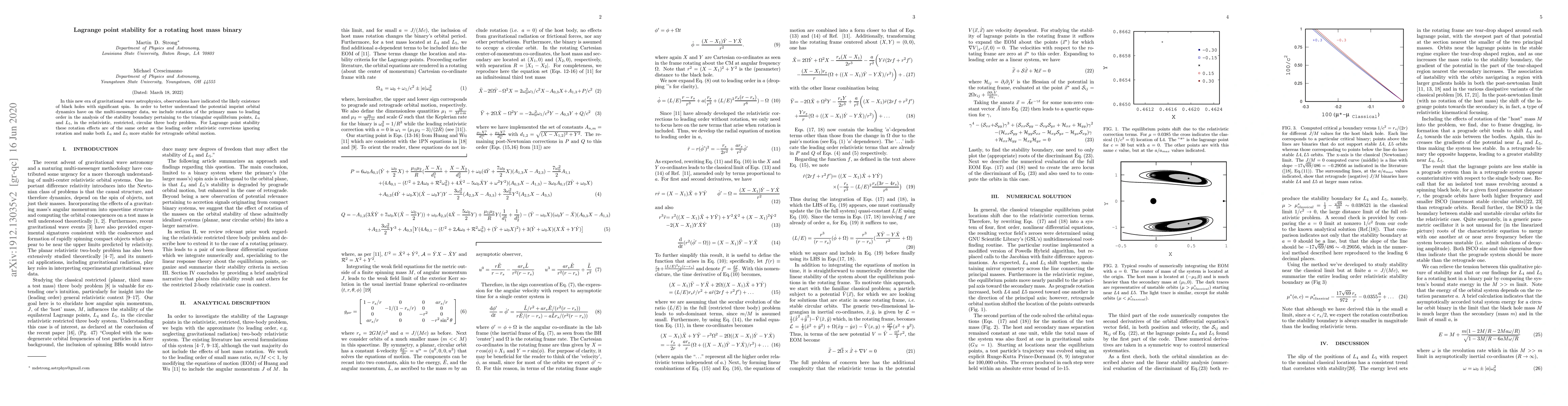 In this new era of gravitational wave astrophysics, observations have indicated the likely existence of black holes with significant spin. In order to better understand the potential imprint orbital dynamics have on the multi-messenger data, we include rotation of the primary mass to leading order in the analysis of the stability boundary pertaining to the triangular equilibrium points, L_4 and L_5, in the relativistic, restricted, circular three body problem. For Lagrange point stability these rotation effects are of the same order as the leading order relativistic corrections ignoring rotation and make both L_4 and L_5 more stable for retrograde orbital motion.