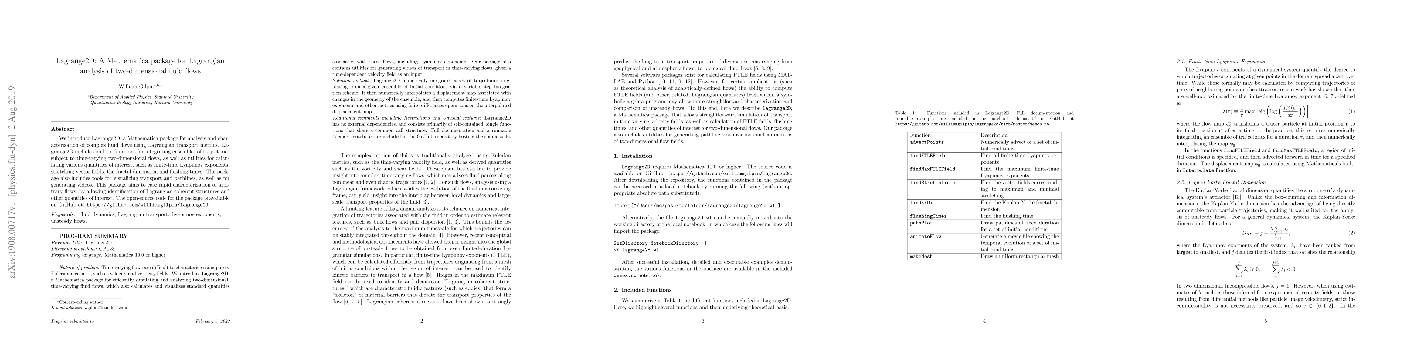 Lagrange2D is a Mathematica package designed for analyzing complex two-dimensional fluid flows using Lagrangian transport metrics. It provides functions for trajectory integration, calculation of transport properties, and visualization tools, facilitating the identification of Lagrangian coherent structures.