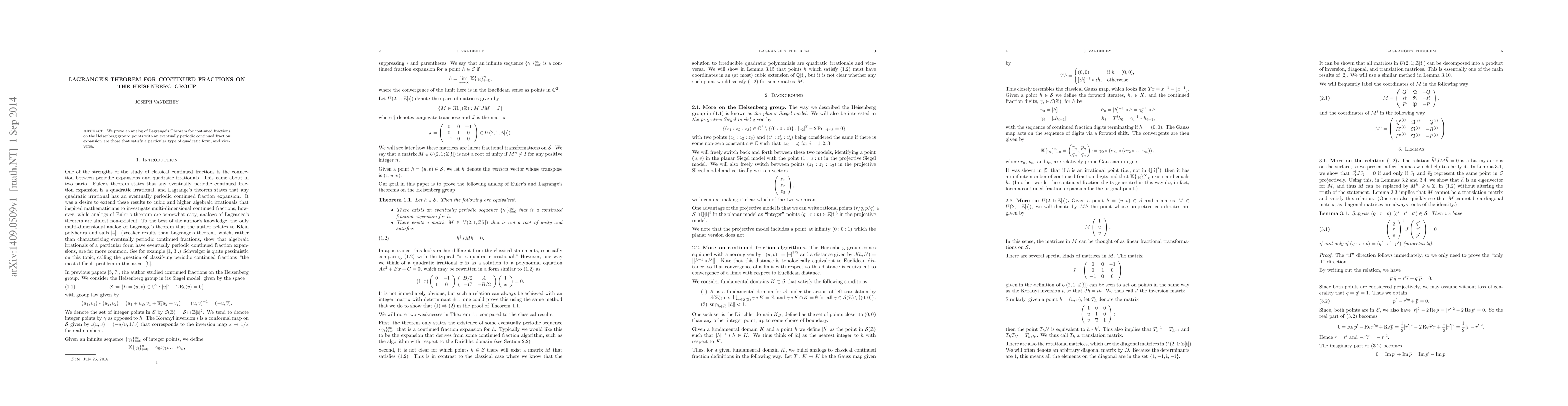 Summary: This paper establishes an analog of Lagrange's Theorem for continued fractions on the Heisenberg group, showing that points with an eventually periodic continued fraction expansion correspond to solutions of a specific quadratic form.