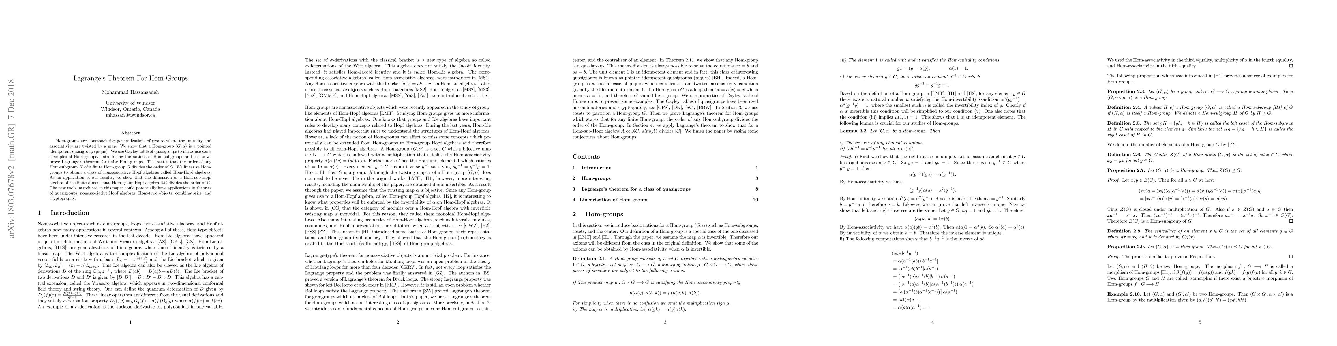 Hom-groups are nonassociative generalizations of groups where the unitality and associativity are twisted by a map. We show that a Hom-group (G, {\alpha}) is a pointed idempotent quasigroup (pique). We use Cayley table of quasigroups to introduce some examples of Hom-groups. Introducing the notions of Hom-subgroups and cosets we prove Lagrange's theorem for finite Hom-groups. This states that the order of any Hom-subgroup H of a finite Hom-group G divides the order of G. We linearize Hom-groups to obtain a class of nonassociative Hopf algebras called Hom-Hopf algebras. As an application of our results, we show that the dimension of a Hom-sub-Hopf algebra of the finite dimensional Hom-group Hopf algebra KG divides the order of G. The new tools introduced in this paper could potentially have applications in theories of quasigroups, nonassociative Hopf algebras, Hom-type objects, combinatorics, and cryptography.