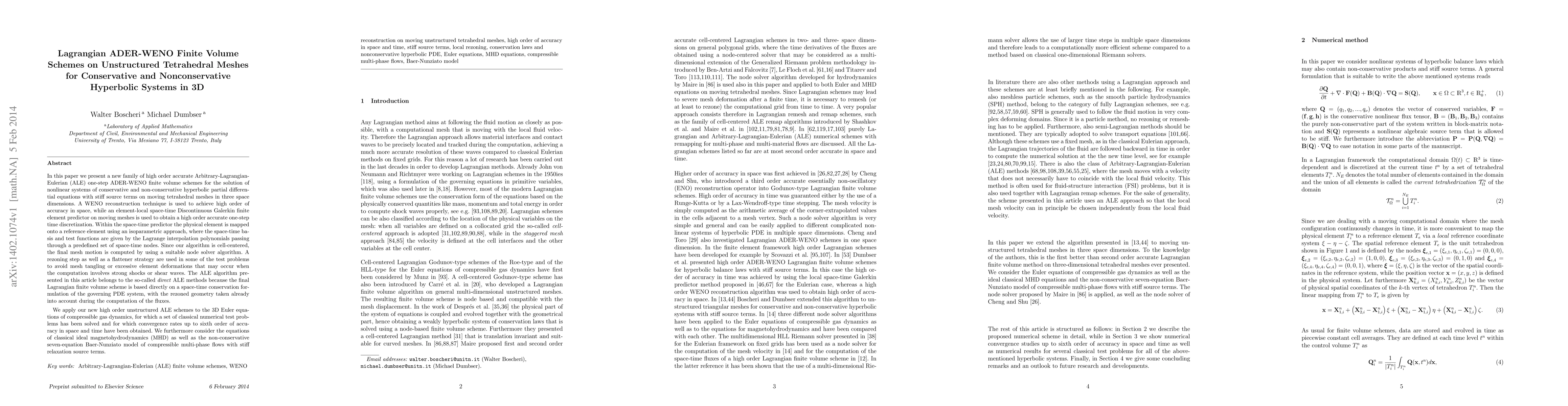 This paper introduces high-order Arbitrary-Lagrangian-Eulerian (ALE) ADER-WENO finite volume schemes on unstructured tetrahedral meshes for solving 3D nonlinear hyperbolic PDEs, achieving up to sixth-order accuracy. The method combines WENO reconstruction for spatial accuracy and a Discontinuous Galerkin predictor for time discretization, with rezoning and flattener strategies to manage mesh deformations.