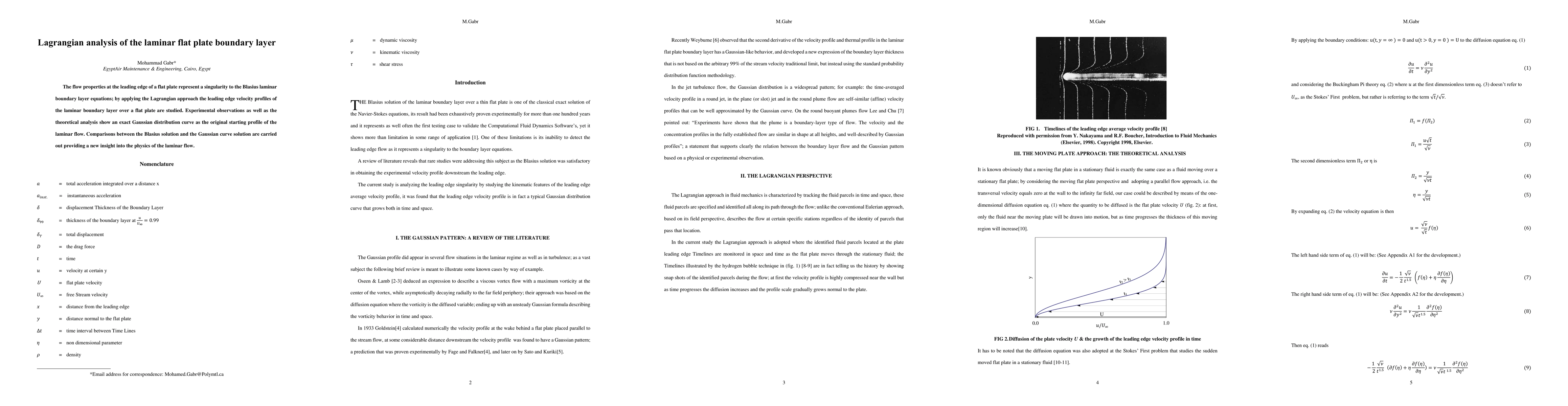 This paper employs a Lagrangian analysis to study the leading edge velocity profiles of the laminar boundary layer over a flat plate, revealing a Gaussian distribution as the initial flow profile. It compares the Blasius solution with the Gaussian curve, offering new insights into the physics of laminar flow.