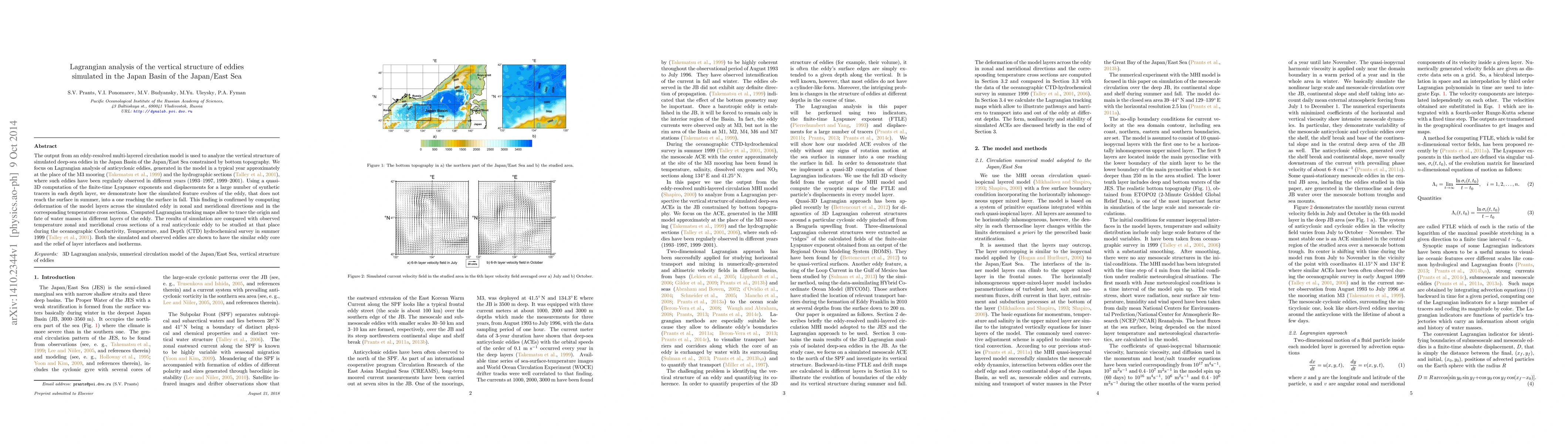 Researchers analyzed vertical structure of simulated deep-sea eddies in Japan Basin using Lagrangian analysis, finding that they evolve from not reaching surface in summer to doing so in fall, with similarities observed between simulation and real-life observations.