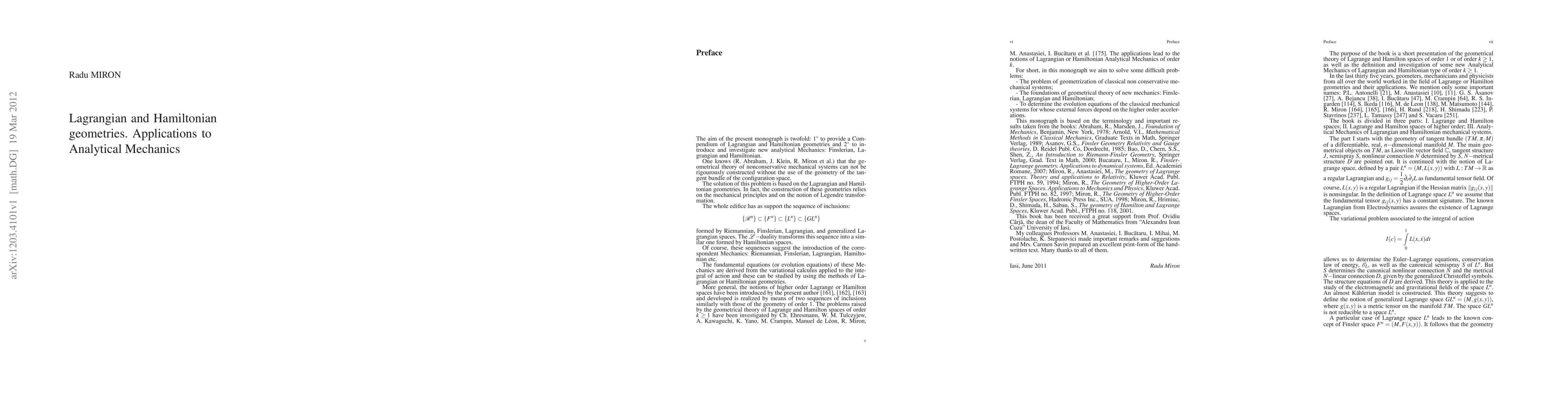 The aim of the present text is twofold: to provide a compendium of Lagrangian and Hamiltonian geometries and to introduce and investigate new analytical Mechanics: Finslerian, Lagrangian and Hamiltonian. The fundamental equations (or evolution equations) of these Mechanics are derived from the variational calculus applied to the integral of action and these can be studied by using the methods of Lagrangian or Hamiltonian geometries. More general, the notions of higher order Lagrange or Hamilton spaces have been introduced and developed by the present author. The applications led to the notions of Lagrangian or Hamiltonian Analytical Mechanics of higher order. For short, in this text we aim to solve some difficult problems: The problem of geometrization of classical non conservative mechanical systems; The foundations of geometrical theory of new mechanics: Finslerian, Lagrangian and Hamiltonian;To determine the evolution equations of the classical mechanical systems for whose external forces depend on the higher order accelerations. My colleagues Professors M. Anastasiei, I. Bucataru, I. Mihai, K. Stepanovici made important remarks and suggestions and Mrs. Carmen Savin prepared an excellent print-form of the hand-written text. Many thanks to all of them.