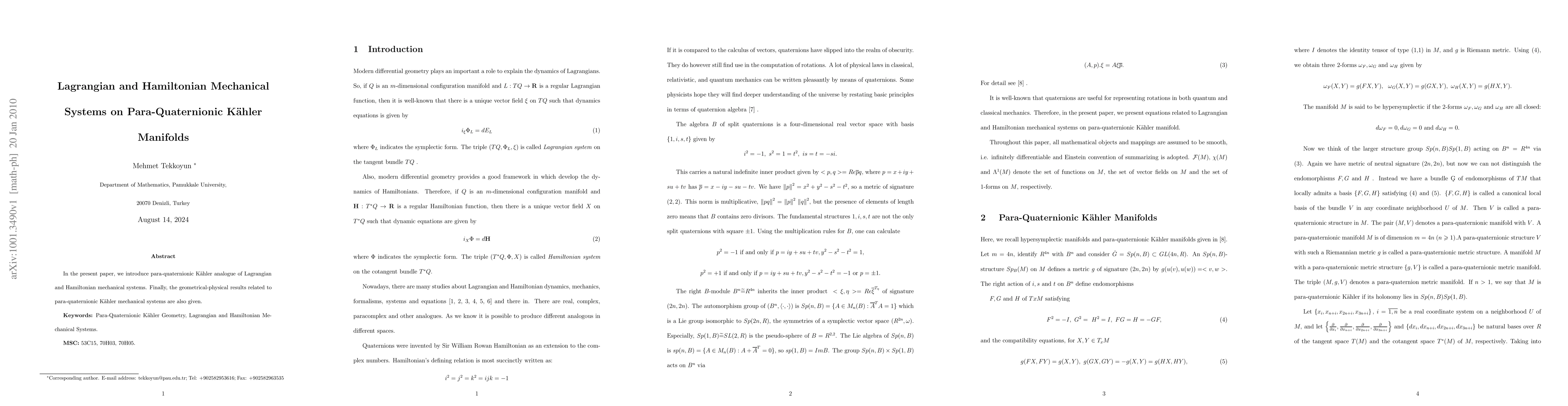 This paper introduces Lagrangian and Hamiltonian frameworks for mechanical systems on para-quaternionic Kähler manifolds, providing geometrical and physical insights into these novel systems. The results highlight the unique characteristics of para-quaternionic Kähler structures in mechanics.