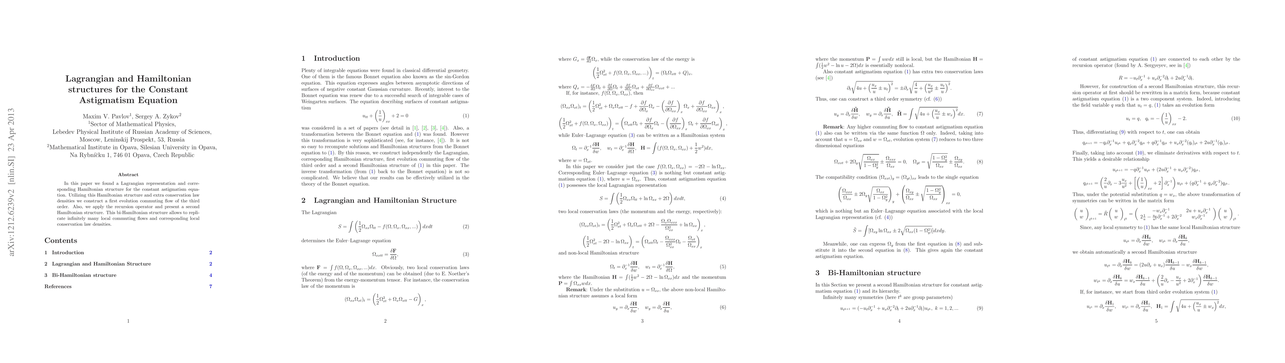This paper develops a Lagrangian and Hamiltonian framework for the constant astigmatism equation, constructing a first evolution commuting flow of third order and a second Hamiltonian structure using a recursion operator, enabling the generation of infinitely many local commuting flows and conservation laws.