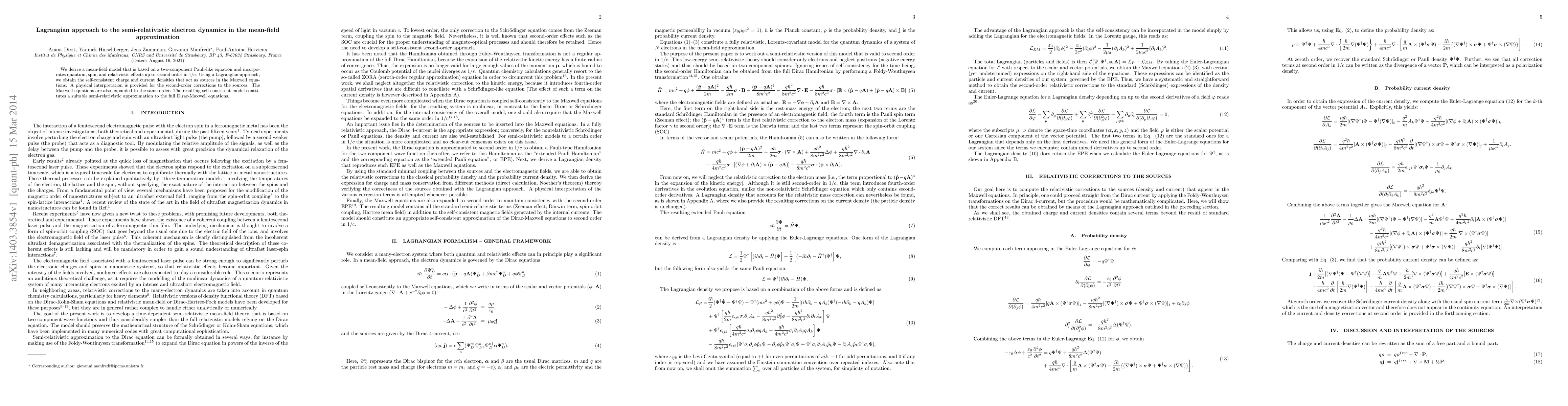 This paper develops a mean-field model for semi-relativistic electron dynamics using a Lagrangian approach, incorporating quantum, spin, and relativistic effects up to second order in $1/c$. The model provides self-consistent charge and current densities, which are used in expanded Maxwell equations, offering a suitable semi-relativistic approximation to the full Dirac-Maxwell equations.