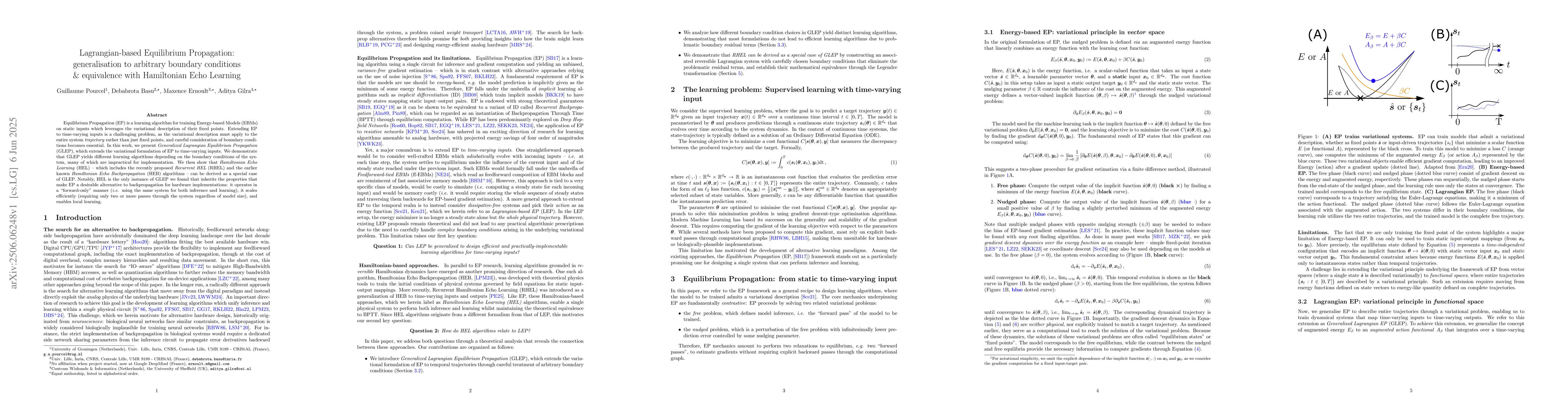 The research introduces Generalized Lagrangian Equilibrium Propagation (GLEP), extending Equilibrium Propagation (EP) to time-varying inputs using a variational formulation. It also demonstrates the equivalence of Hamiltonian Echo Learning (HEL) algorithms, including RHEL and HEB, to GLEP under specific boundary conditions.