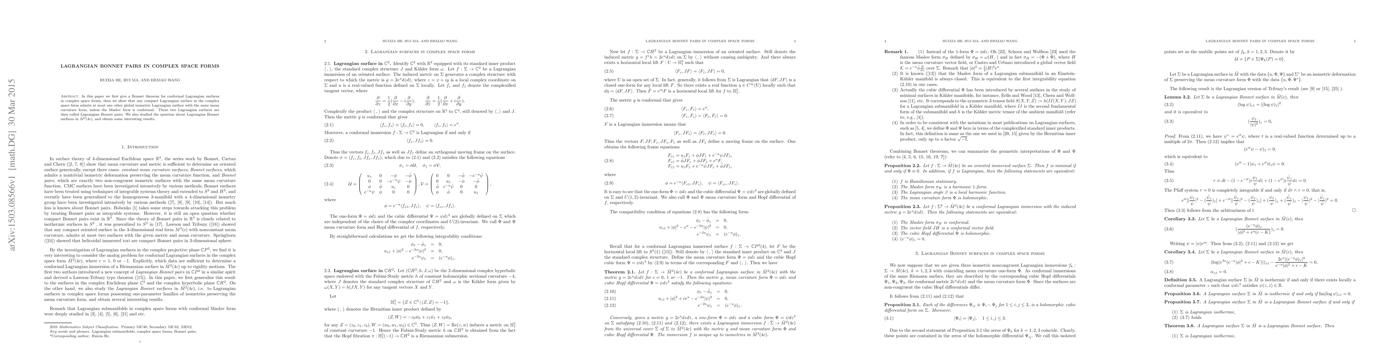 This paper establishes a Bonnet theorem for conformal Lagrangian surfaces in complex space forms and demonstrates that any compact Lagrangian surface can have at most one other global isometric Lagrangian surface with the same mean curvature, forming Lagrangian Bonnet pairs unless the Maslov form is conformal.