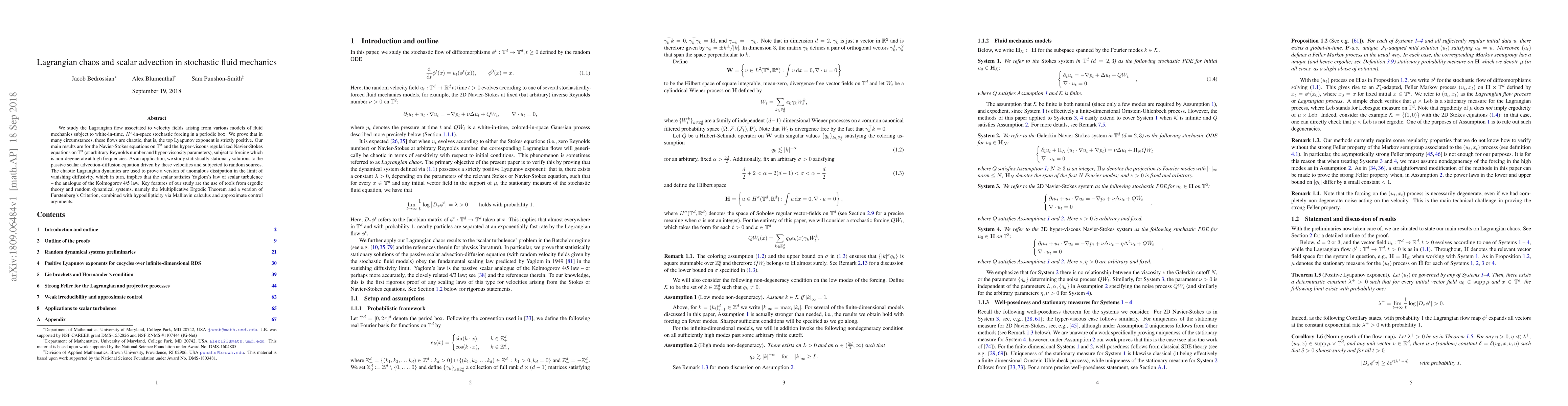 This paper investigates the chaotic behavior of Lagrangian flows in stochastic fluid mechanics, proving positive top Lyapunov exponents for Navier-Stokes and hyper-viscous equations under white noise forcing. It also explores anomalous dissipation in scalar advection-diffusion, demonstrating the validity of Yaglom's law in turbulent conditions.
