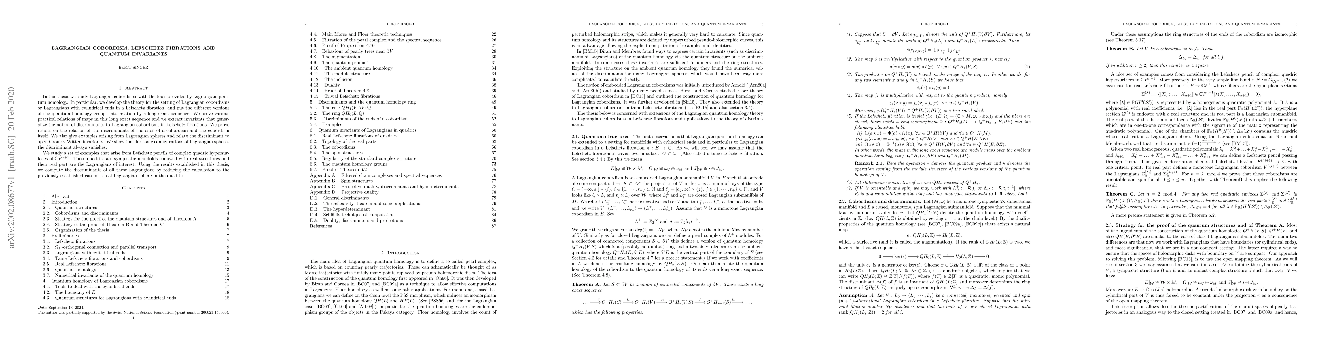 This paper develops Lagrangian quantum homology to study Lagrangian cobordisms within Lefschetz fibrations, establishing a long exact sequence relating different versions of quantum homology groups and extracting invariants that generalize discriminants. It also computes discriminants for Lagrangians arising from complex quadric hypersurfaces.