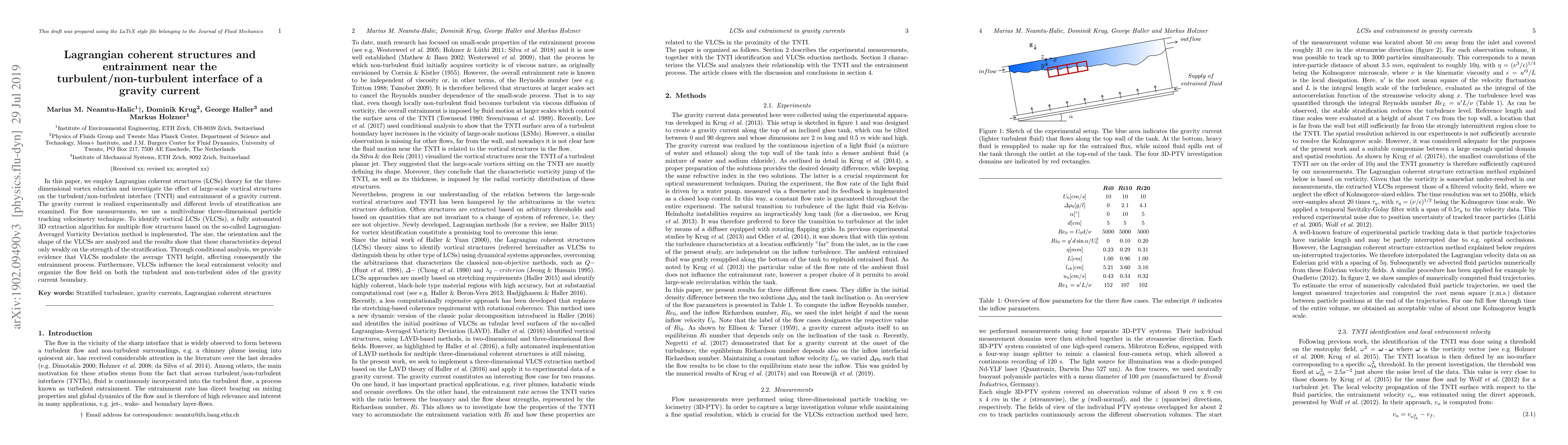 This paper uses Lagrangian coherent structures theory to analyze large-scale vortical structures' impact on the turbulent/non-turbulent interface and entrainment in a gravity current. The study reveals that vortical LCSs modulate the TNTI height and influence local entrainment velocity, organizing the flow field on both sides of the gravity current boundary.