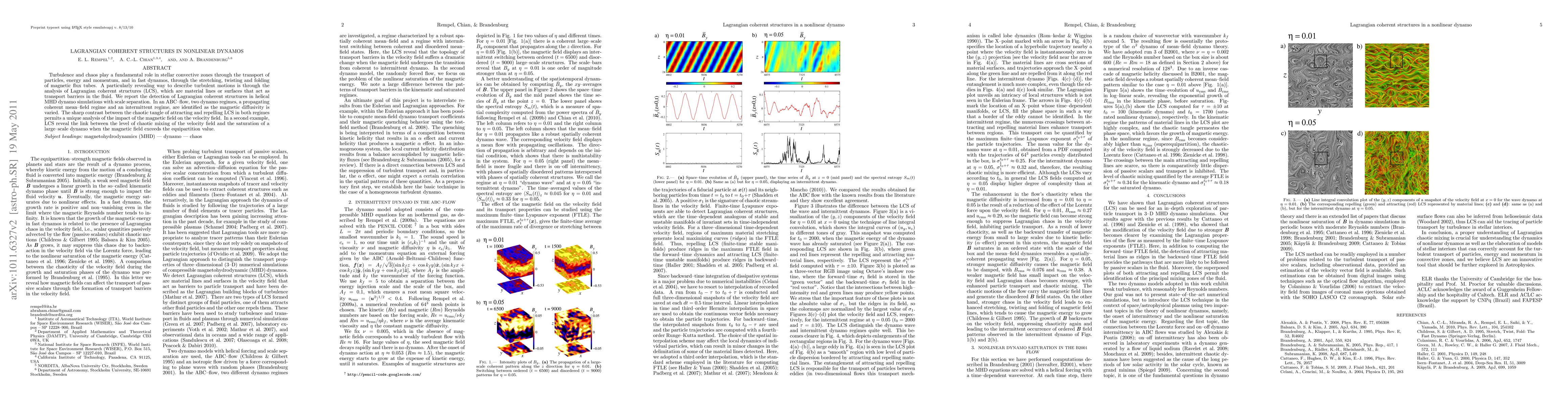 This paper identifies Lagrangian coherent structures (LCS) in helical MHD dynamo simulations, revealing two dynamo regimes: a propagating coherent mean-field regime and an intermittent regime. LCS analysis highlights the impact of magnetic fields on the velocity field and links chaotic mixing with the saturation of large-scale dynamos.