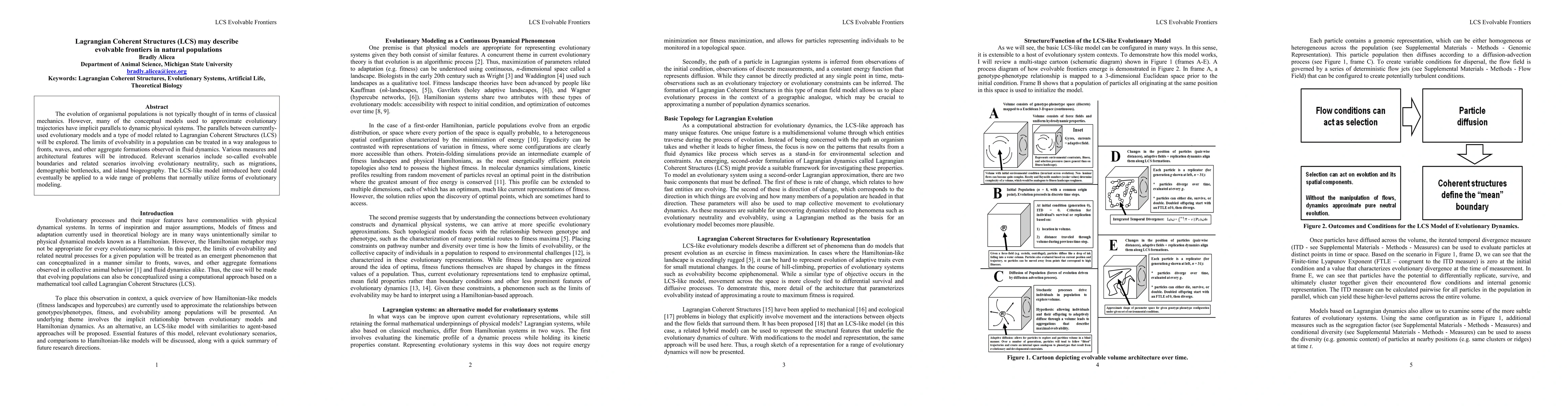 This paper explores the application of Lagrangian Coherent Structures (LCS) to describe evolvable frontiers in natural populations, drawing parallels between evolutionary models and dynamic physical systems. The study introduces measures and features analogous to fluid dynamics to model evolutionary boundaries and neutrality.