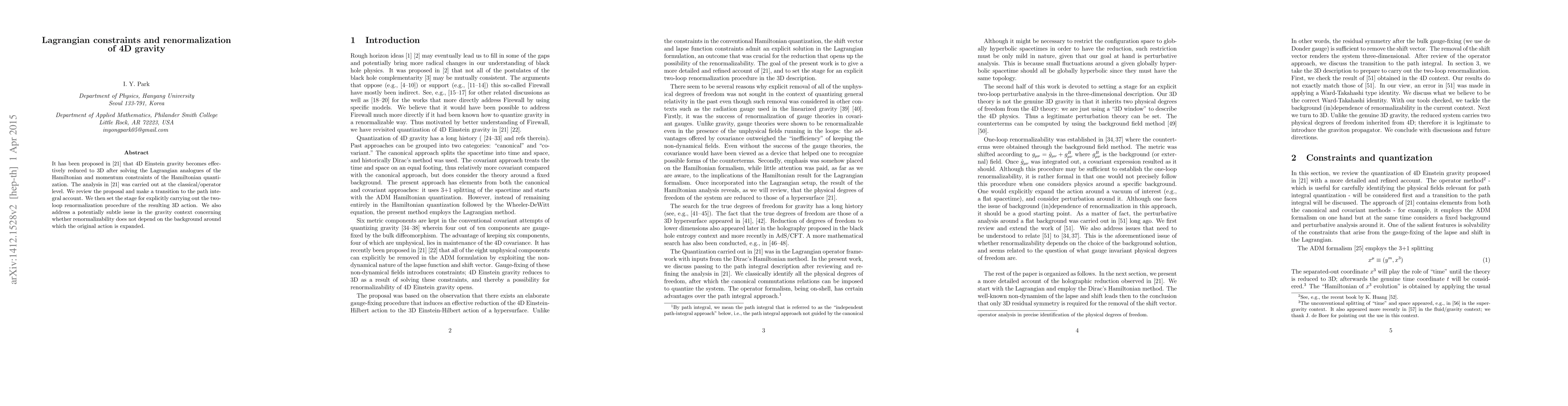 It has been proposed in \cite{Park:2014tia} that 4D Einstein gravity becomes effectively reduced to 3D after solving the Lagrangian analogues of the Hamiltonian and momentum constraints of the Hamiltonian quantization. The analysis in \cite{Park:2014tia} was carried out at the classical/operator level. We review the proposal and make a transition to the path integral account. We then set the stage for explicitly carrying out the two-loop renormalization procedure of the resulting 3D action. We also address a potentially subtle issue in the gravity context concerning whether renormalizability does not depend on the background around which the original action is expanded.