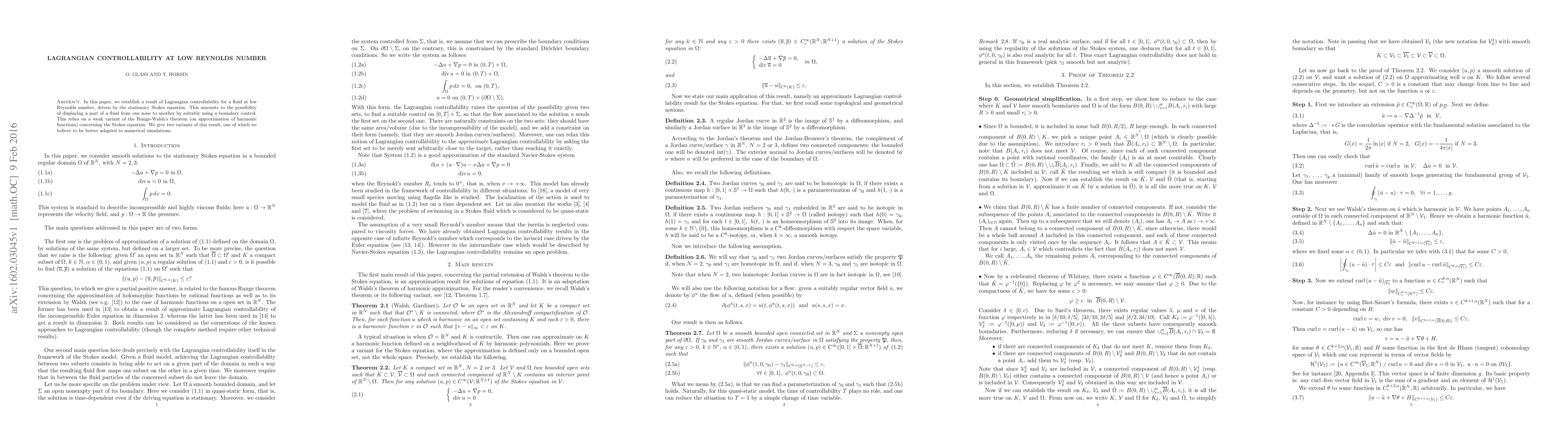 Researchers establish a new result on Lagrangian controllability for fluids at low Reynolds number, showing it's possible to displace fluid with boundary control. This finding relies on a variant of Runge-Walsh's theorem adapted to numerical simulations.