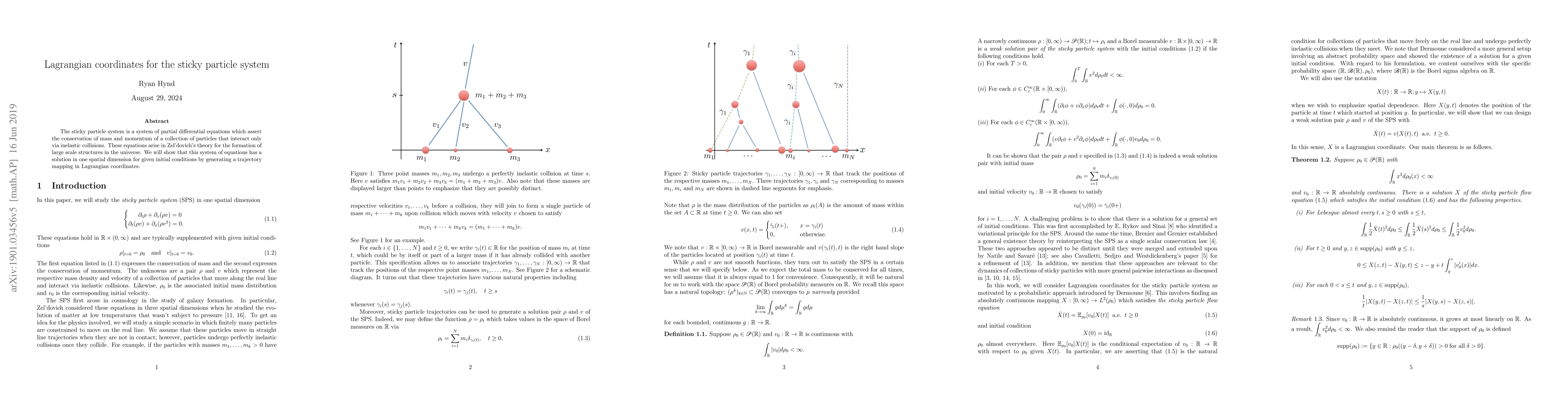 The research employs Lagrangian coordinates to demonstrate the existence of solutions for the sticky particle system, a system of partial differential equations describing the conservation of mass and momentum of particles interacting via inelastic collisions, relevant in Zel'dovich's theory for large scale structure formation in the universe.