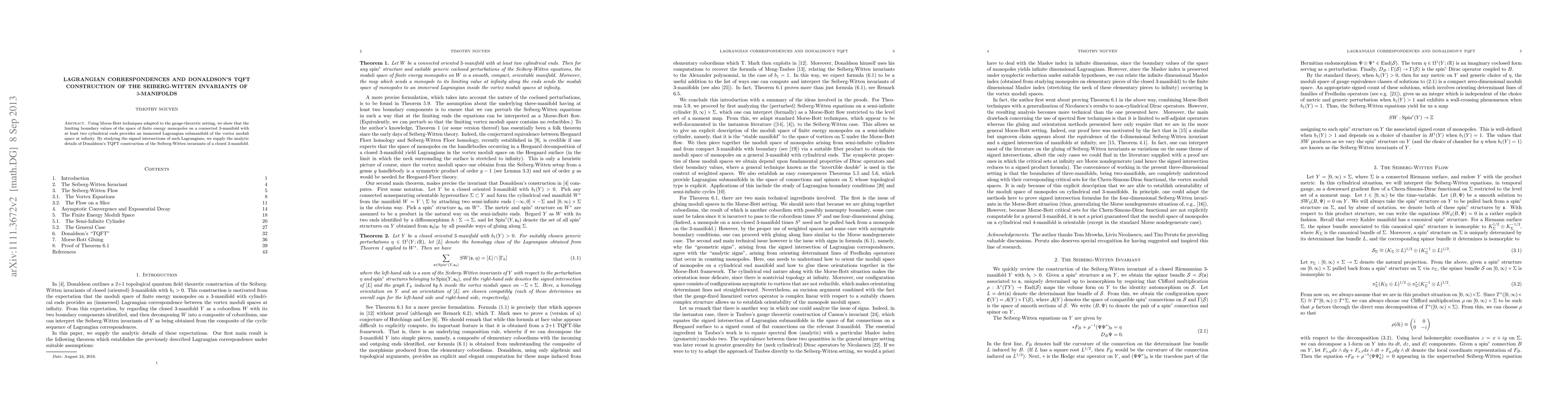 Using Morse-Bott techniques adapted to the gauge-theoretic setting, we show that the limiting boundary values of the space of finite energy monopoles on a connected 3-manifold with at least two cylindrical ends provides an immersed Lagrangian submanifold of the vortex moduli space at infinity. By studying the signed intersections of such Lagrangians, we supply the analytic details of Donaldson's TQFT construction of the Seiberg-Witten invariants of a closed 3-manifold.