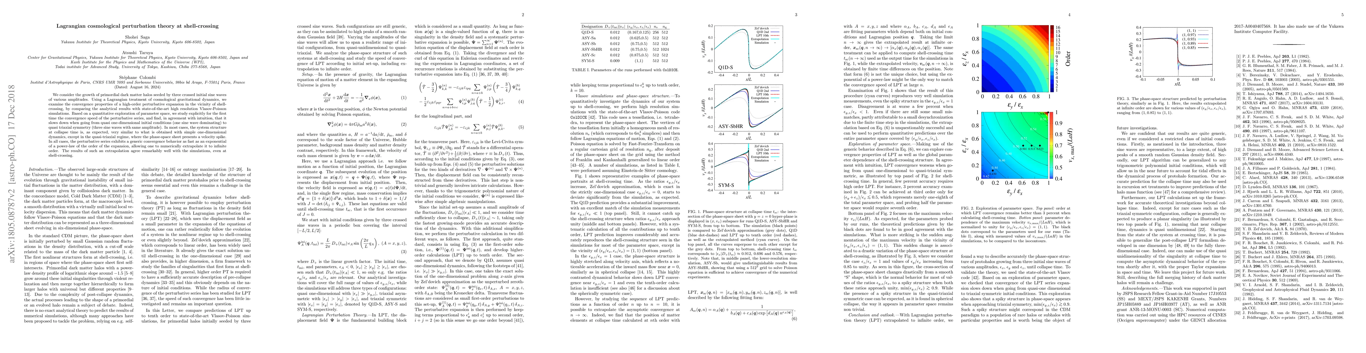 We consider the growth of primordial dark matter halos seeded by three crossed initial sine waves of various amplitudes. Using a Lagrangian treatment of cosmological gravitational dynamics, we examine the convergence properties of a high-order perturbative expansion in the vicinity of shell-crossing, by comparing the analytical results with state-of-the-art high resolution Vlasov-Poisson simulations. Based on a quantitative exploration of parameter space, we study explicitly for the first time the convergence speed of the perturbative series, and find, in agreement with intuition, that it slows down when going from quasi one-dimensional initial conditions (one sine wave dominating) to quasi triaxial symmetry (three sine waves with same amplitude). In most cases, the system structure at collapse time is, as expected, very similar to what is obtained with simple one-dimensional dynamics, except in the quasi-triaxial regime, where the phase-space sheet presents a velocity spike. In all cases, the perturbative series exhibits a generic convergence behavior as fast as an exponential of a power-law of the order of the expansion, allowing one to numerically extrapolate it to infinite order. The results of such an extrapolation agree remarkably well with the simulations, even at shell-crossing.