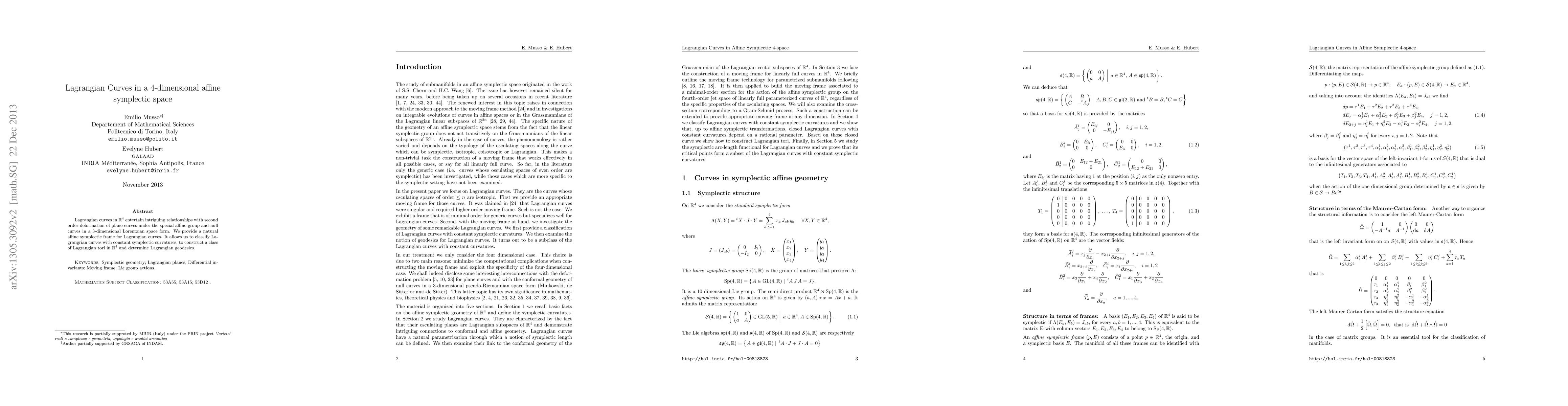 Lagrangian curves in 4-space entertain intriguing relationships with second order deformation of plane curves under the special affine group and null curves in a 3-dimensional Lorentzian space form. We provide a natural affine symplectic frame for Lagrangian curves. It allows us to classify Lagrangrian curves with constant symplectic curvatures, to construct a class of Lagrangian tori and determine Lagrangian geodesics.