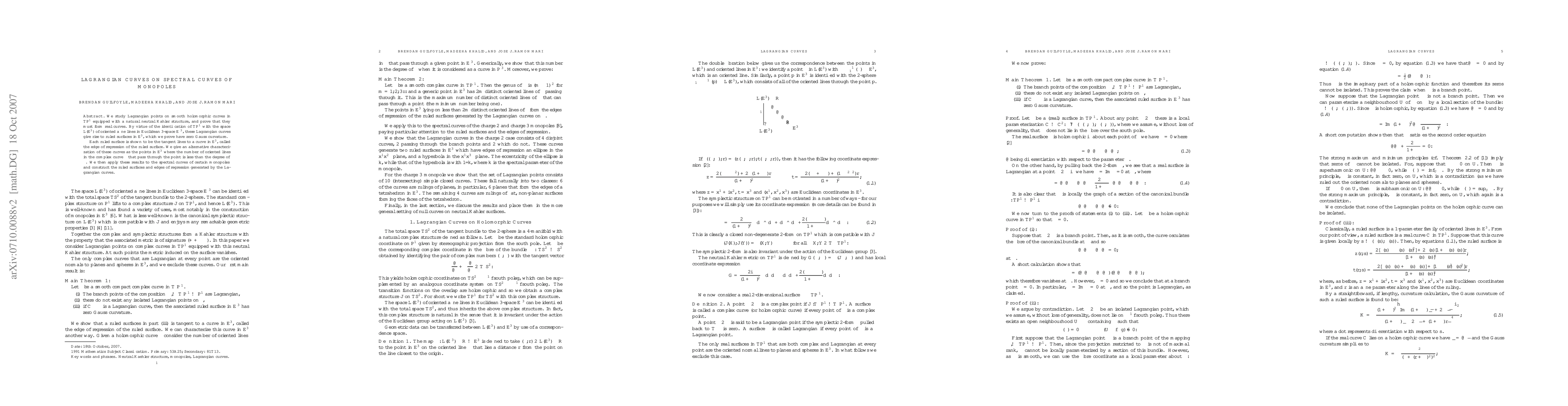 Research shows that Lagrangian curves on spectral curves of monopoles form real curves in 3D space, giving rise to ruled surfaces with zero Gauss curvature.