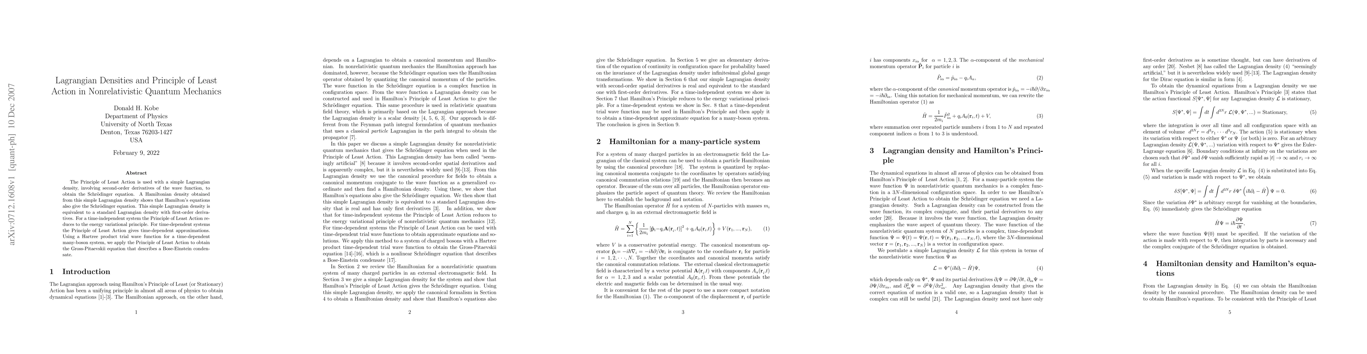 The Principle of Least Action is used with a simple Lagrangian density, involving second-order derivatives of the wave function, to obtain the Schroedinger equation. A Hamiltonian density obtained from this simple Lagrangian density shows that Hamilton's equations also give the Schroedinger equation. This simple Lagrangian density is equivalent to a standard Lagrangian density with first-order derivatives. For a time-independent system the Principle of Least Action reduces to the energy variational principle. For time-dependent systems the Principle of Least Action gives time-dependent approximations. Using a Hartree product trial wave function for a time-dependent many-boson system, we apply the Principle of Least Action to obtain the Gross-Pitaevskii equation that describes a Bose-Einstein condensate.