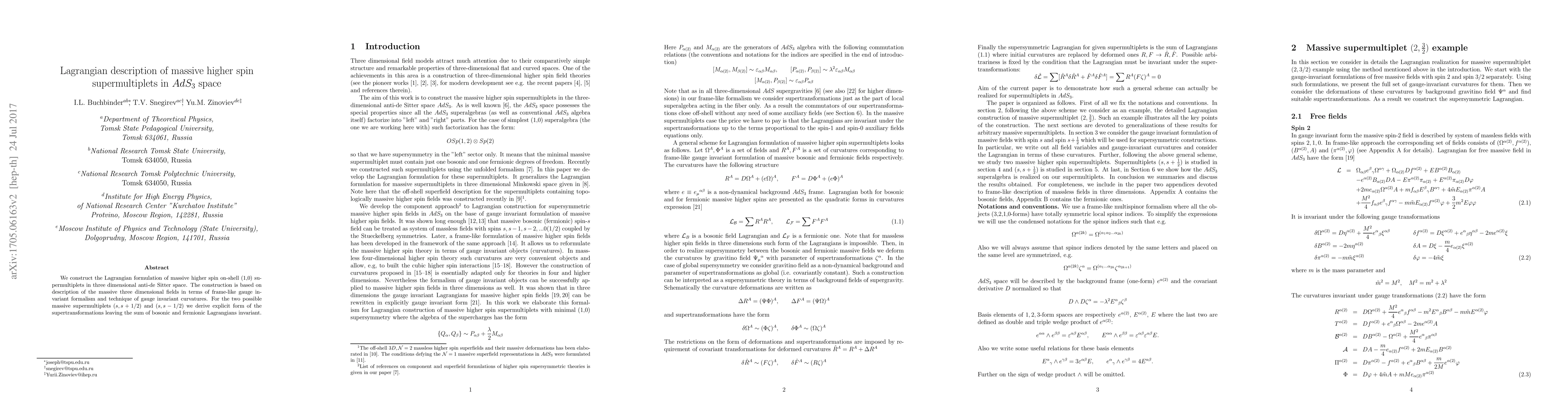 Summary: The paper develops a Lagrangian framework for massive higher spin supermultiplets in AdS_3 space, employing a frame-like gauge invariant formalism. It explicitly derives the supertransformations for the (s,s+1/2) and (s,s-1/2) supermultiplets that preserve the combined bosonic and fermionic Lagrangians.
