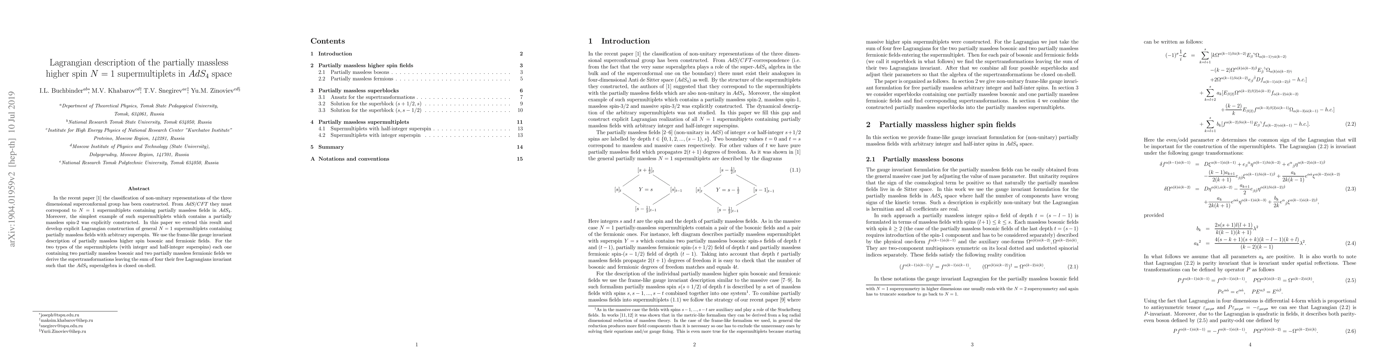 In the recent paper [1] the classification of non-unitary representations of the three dimensional superconformal group has been constructed. From AdS/CFT they must correspond to N=1 supermultiplets containing partially massless fields in $AdS_4$. Moreover, the simplest example of such supermultiplets which contains a partially massless spin-2 was explicitly constructed. In this paper we extend this result and develop explicit Lagrangian construction of general N=1 supermultiplets containing partially massless fields with arbitrary superspin. We use the frame-like gauge invariant description of partially massless higher spin bosonic and fermionic fields. For the two types of the supermultiplets (with integer and half-integer superspins) each one containing two partially massless bosonic and two partially massless fermionic fields we derive the supertransformations leaving the sum of four their free Lagrangians invariant such that the $AdS_4$ superalgebra is closed on-shell.