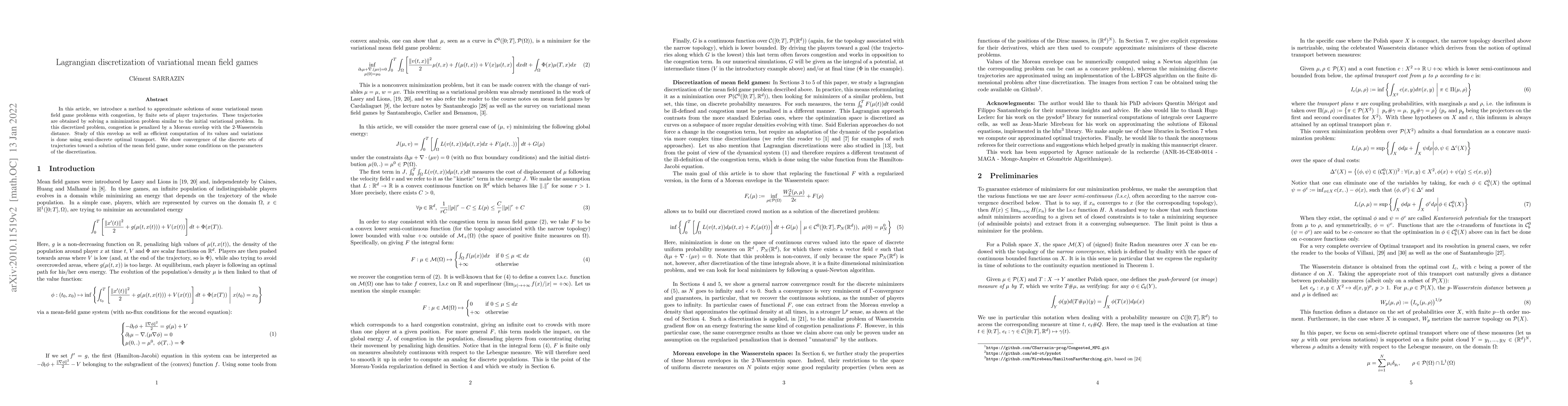 In this article, we introduce a method to approximate solutions of some variational mean field game problems with congestion, by finite sets of player trajectories. These trajectories are obtained by solving a minimization problem similar to the initial variational problem. In this discretized problem, congestion is penalized by a Moreau envelop with the 2-Wasserstein distance. Study of this envelop as well as efficient computation of its values and variations is done using semi-discrete optimal transport. We show convergence of the discrete sets of trajectories toward a solution of the mean field game, under some conditions on the parameters of the discretization.
