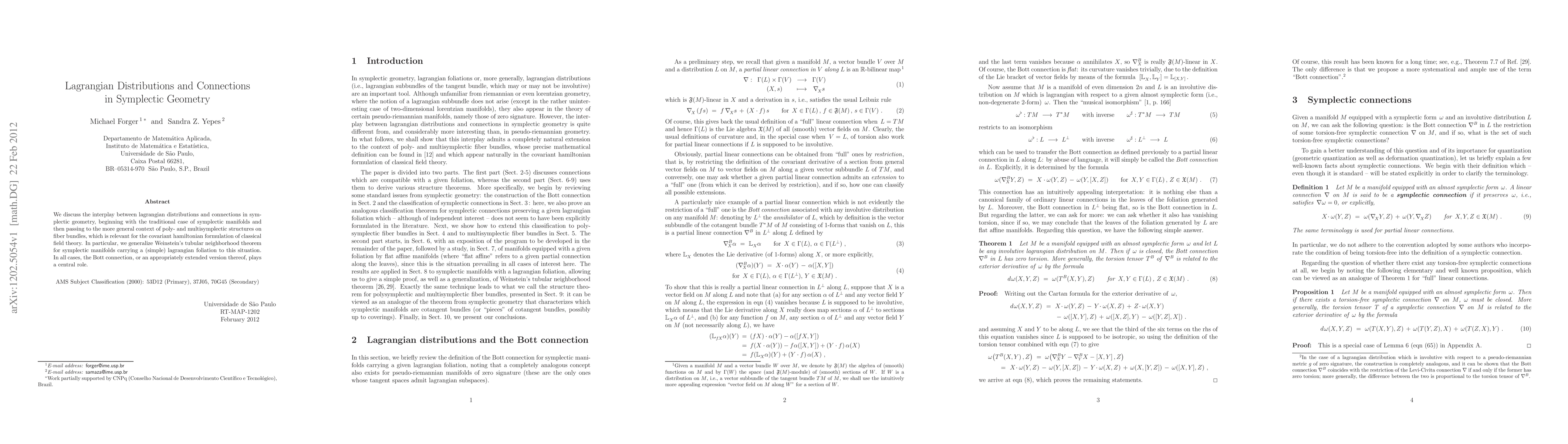 This paper explores the relationship between Lagrangian distributions and connections in symplectic geometry, extending traditional concepts to poly- and multisymplectic structures on fiber bundles. It generalizes Weinstein's tubular neighborhood theorem for Lagrangian foliations and highlights the central role of the Bott connection.