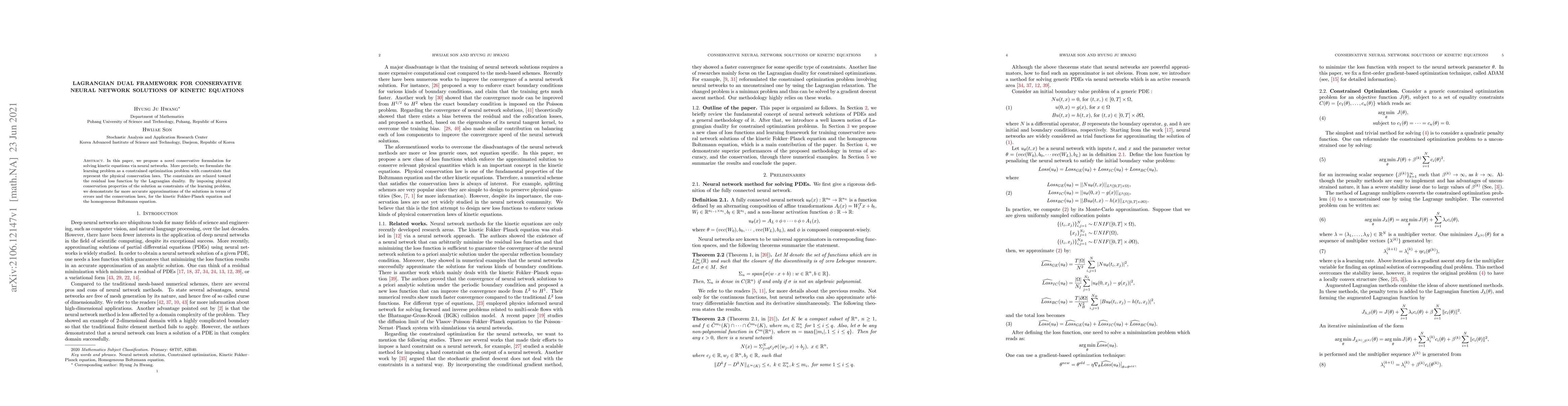 This paper proposes a new method for solving kinetic equations using neural networks, incorporating physical conservation laws as constraints to achieve more accurate approximations.