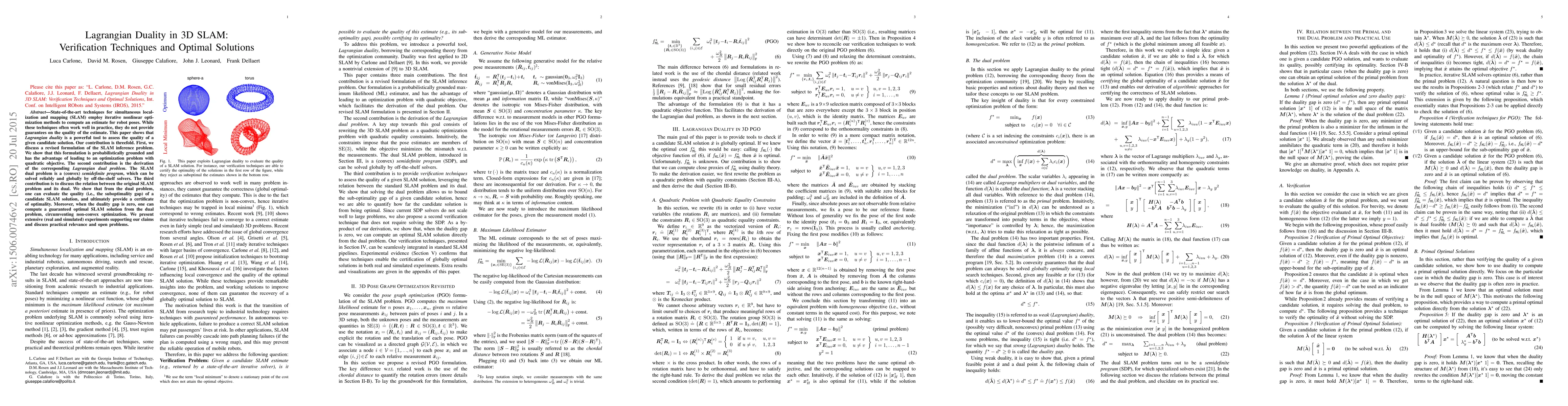 State-of-the-art techniques for simultaneous localization and mapping (SLAM) employ iterative nonlinear optimization methods to compute an estimate for robot poses. While these techniques often work well in practice, they do not provide guarantees on the quality of the estimate. This paper shows that Lagrangian duality is a powerful tool to assess the quality of a given candidate solution. Our contribution is threefold. First, we discuss a revised formulation of the SLAM inference problem. We show that this formulation is probabilistically grounded and has the advantage of leading to an optimization problem with quadratic objective. The second contribution is the derivation of the corresponding Lagrangian dual problem. The SLAM dual problem is a (convex) semidefinite program, which can be solved reliably and globally by off-the-shelf solvers. The third contribution is to discuss the relation between the original SLAM problem and its dual. We show that from the dual problem, one can evaluate the quality (i.e., the suboptimality gap) of a candidate SLAM solution, and ultimately provide a certificate of optimality. Moreover, when the duality gap is zero, one can compute a guaranteed optimal SLAM solution from the dual problem, circumventing non-convex optimization. We present extensive (real and simulated) experiments supporting our claims and discuss practical relevance and open problems.