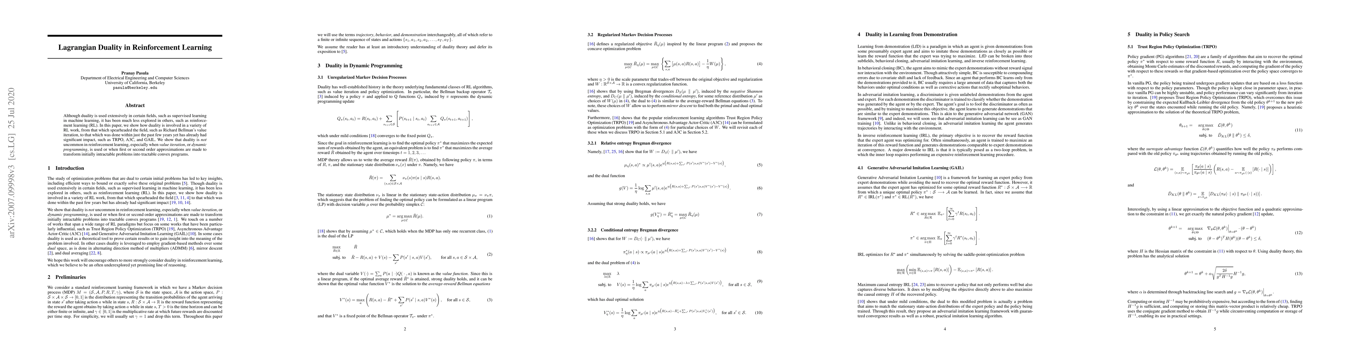 This paper explores the application of Lagrangian duality in reinforcement learning, showing its relevance to various algorithms like value iteration and TRPO, and highlighting its use in transforming difficult problems into tractable convex programs.