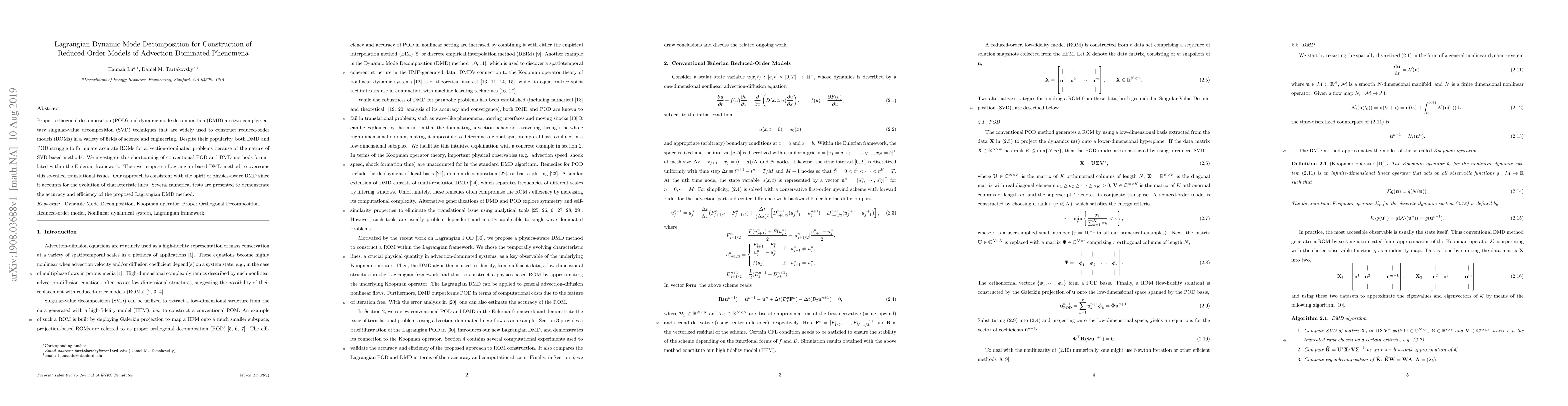 Proper orthogonal decomposition (POD) and dynamic mode decomposition (DMD) are two complementary singular-value decomposition (SVD) techniques that are widely used to construct reduced-order models (ROMs) in a variety of fields of science and engineering. Despite their popularity, both DMD and POD struggle to formulate accurate ROMs for advection-dominated problems because of the nature of SVD-based methods. We investigate this shortcoming of conventional POD and DMD methods formulated within the Eulerian framework. Then we propose a Lagrangian-based DMD method to overcome this so-called translational issues. Our approach is consistent with the spirit of physics-aware DMD since it accounts for the evolution of characteristic lines. Several numerical tests are presented to demonstrate the accuracy and efficiency of the proposed Lagrangian DMD method.