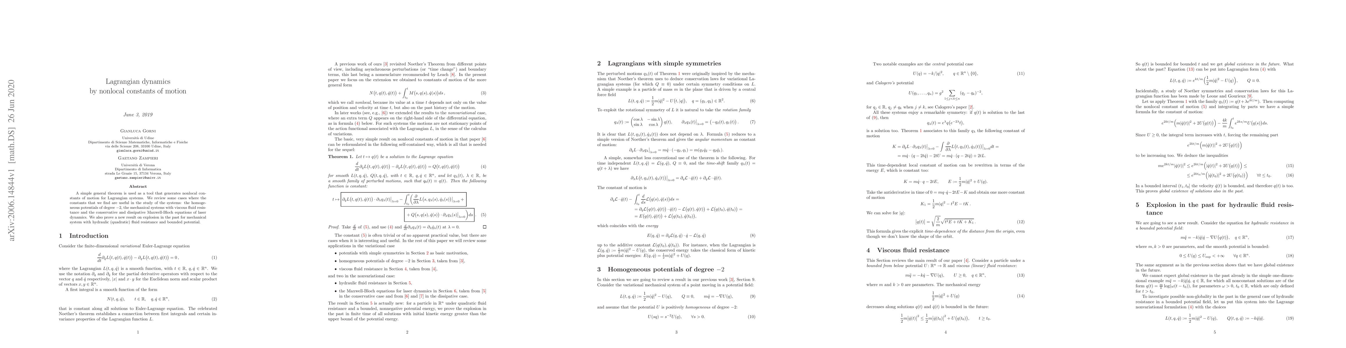 A simple general theorem is used as a tool that generates nonlocal constants of motion for Lagrangian systems. We review some cases where the constants that we find are useful in the study of the systems: the homogeneous potentials of degree~$-2$, the mechanical systems with viscous fluid resistance and the conservative and dissipative Maxwell-Bloch equations of laser dynamics. We also prove a new result on explosion in the past for mechanical system with hydraulic (quadratic) fluid resistance and bounded potential.